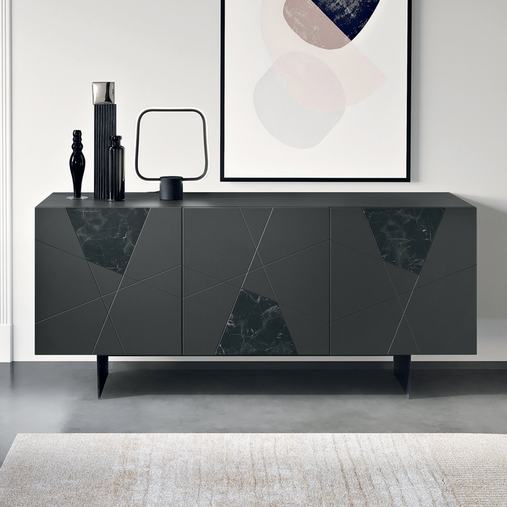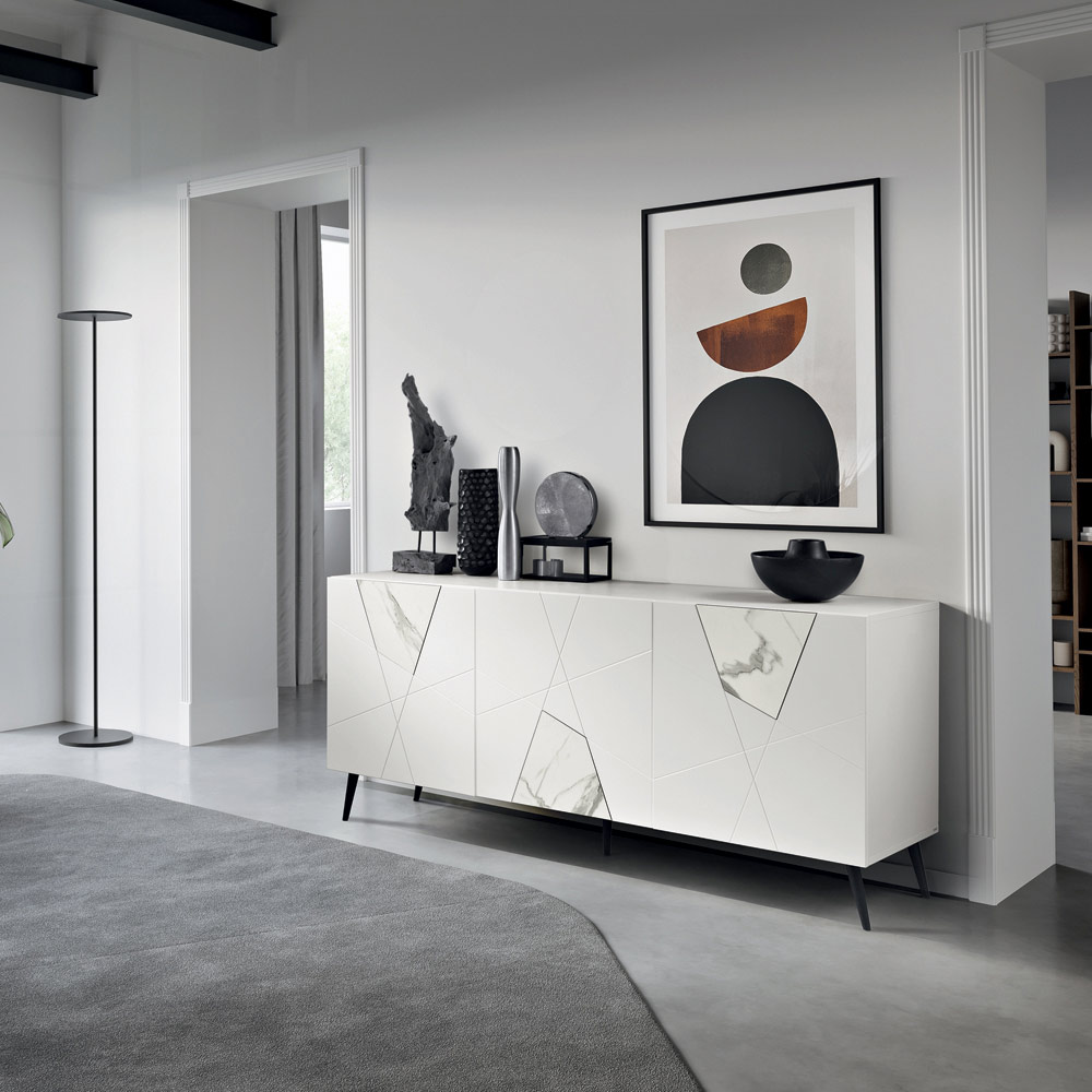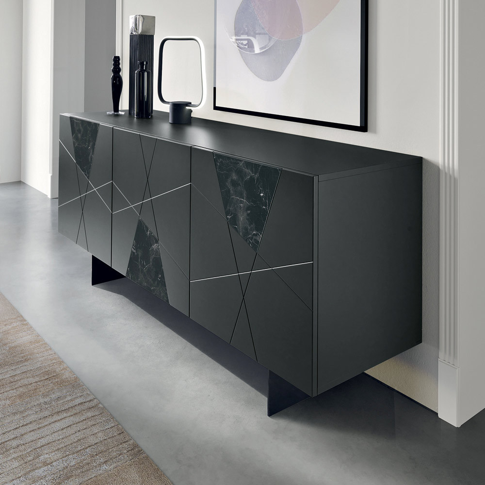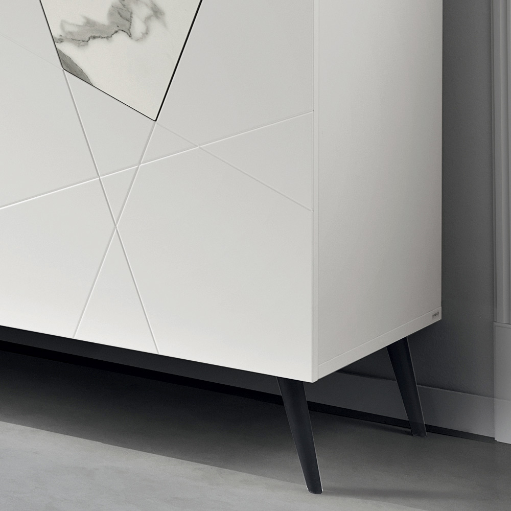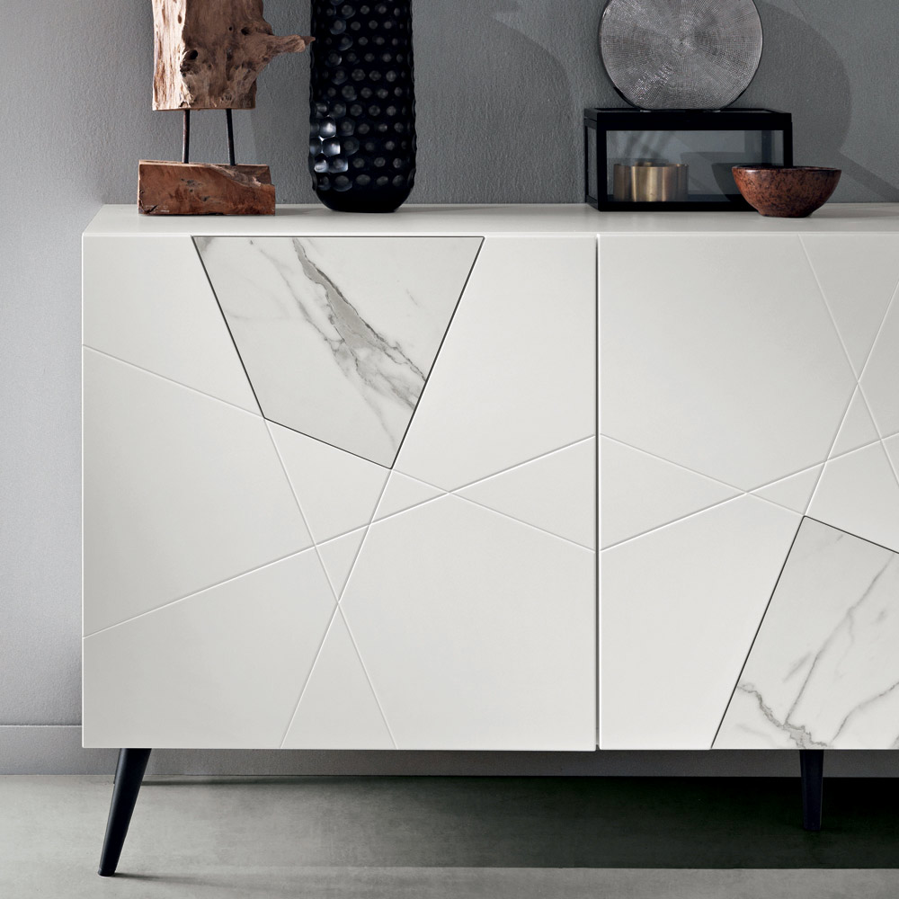 Strukturen er lavet af en melaminbelagt træramme og pantograferede MDF-døre med dekorative graveringer, der krydser hinanden i et elegant geometrisk design. Glasindsatserne med marmoreffekt beriger overfladen og skaber et sofistikeret samspil mellem grafik og materialer.