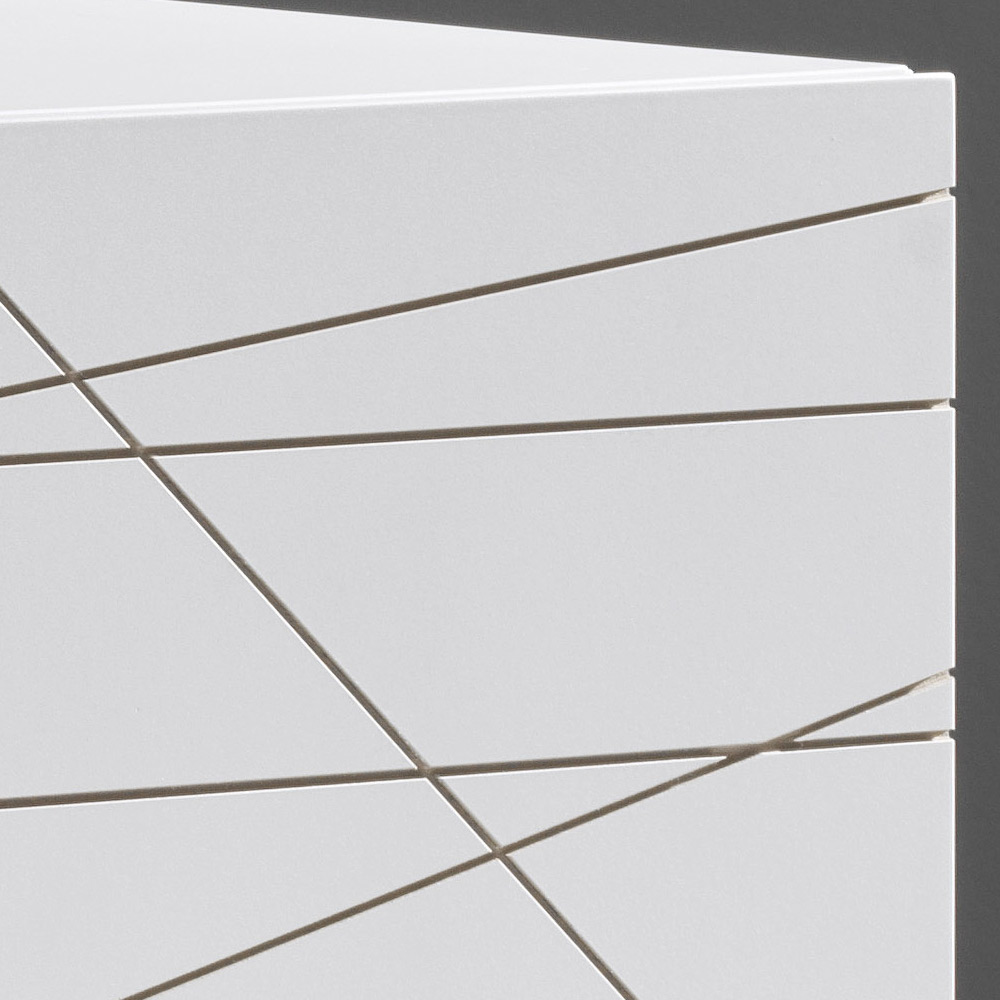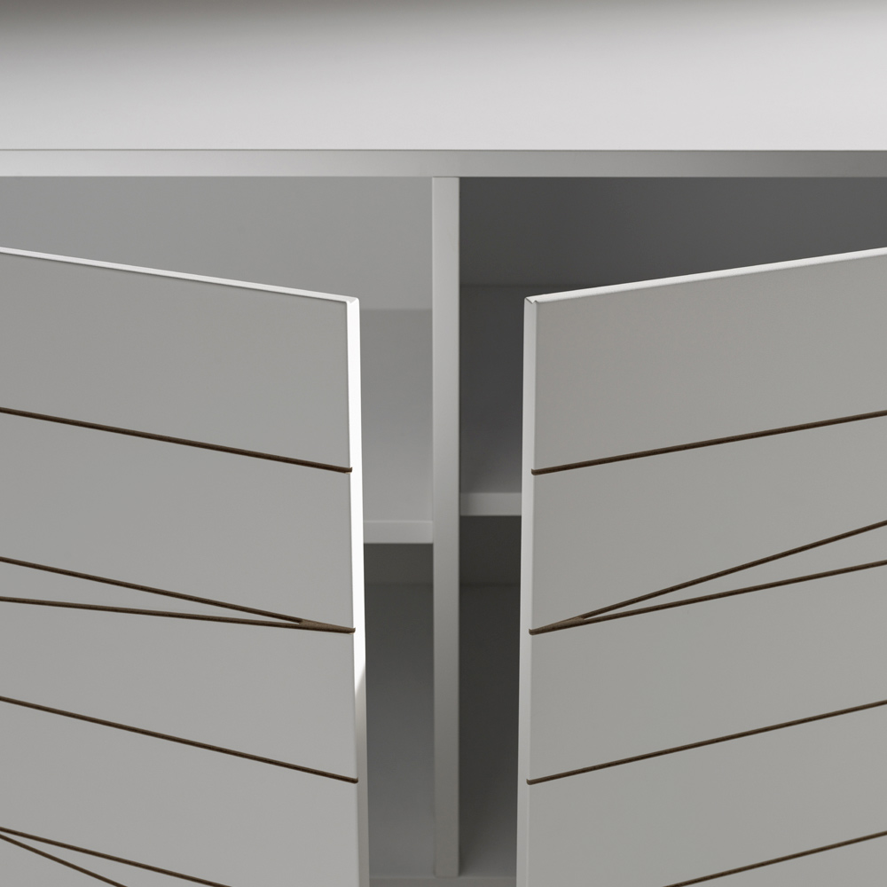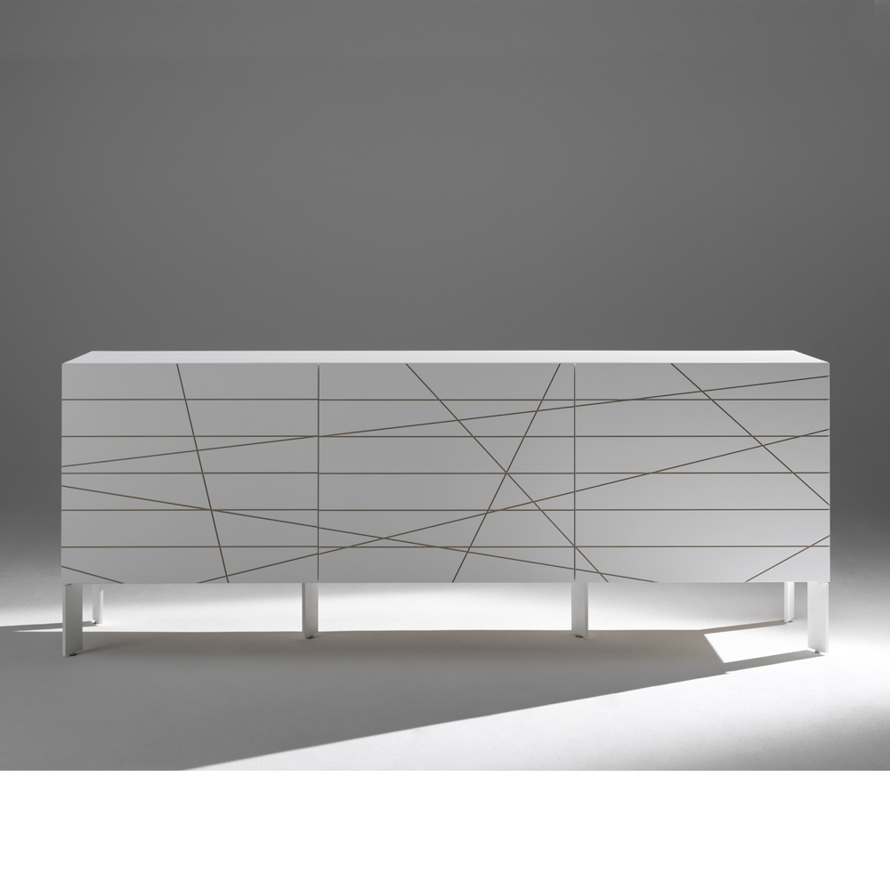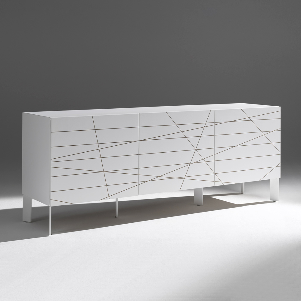 En visuelt iøjnefaldende skænk, designet til moderne og designermiljøer. Dørene har et raffineret, graveret grafisk design, der skaber en dynamisk sammenvævning af linjer og tilføjer bevægelse til overfladen, hvilket forvandler møblet til et ægte dekorativt element.