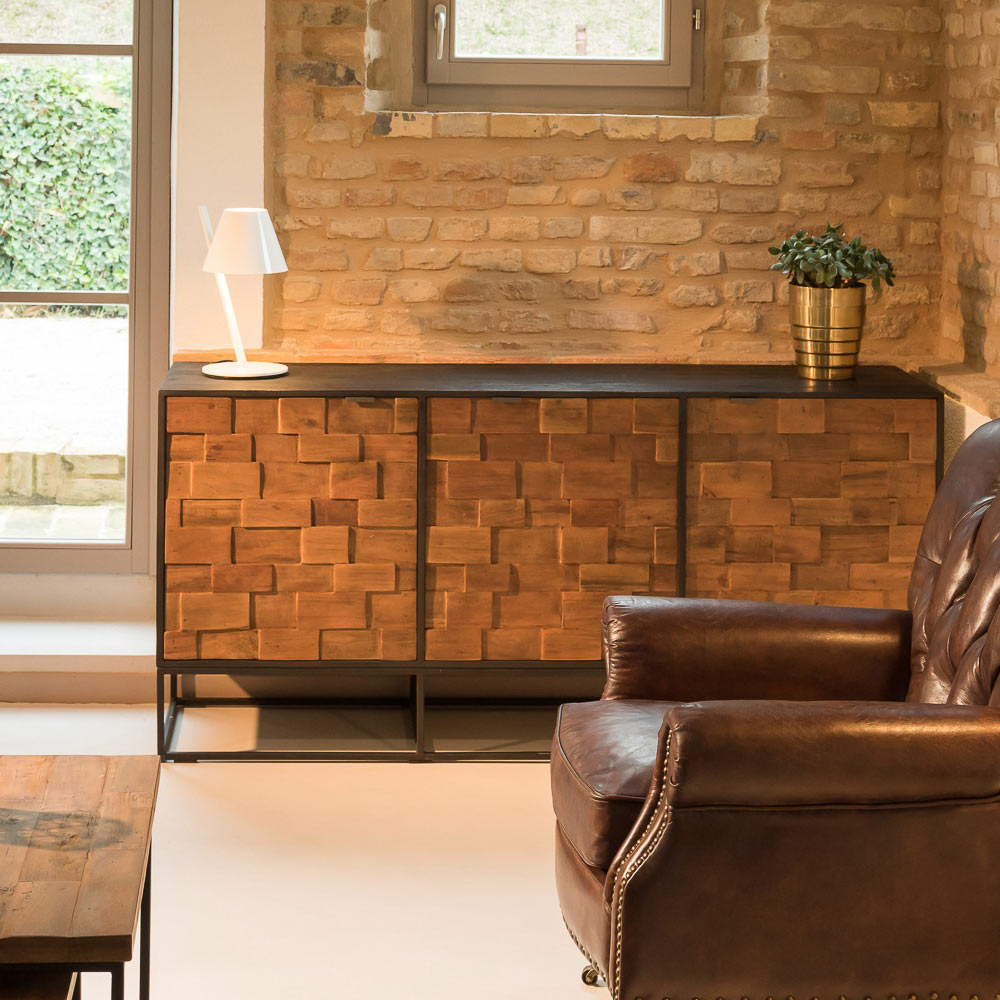 Indendørs skænk lavet af naturligt kaffefarvet genbrugstræ med 3 hoveddøre i patchwork træ og krop i børstet sort metal.