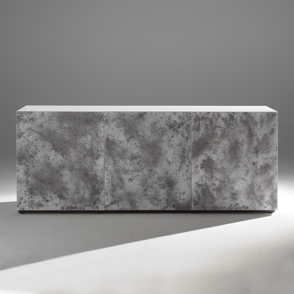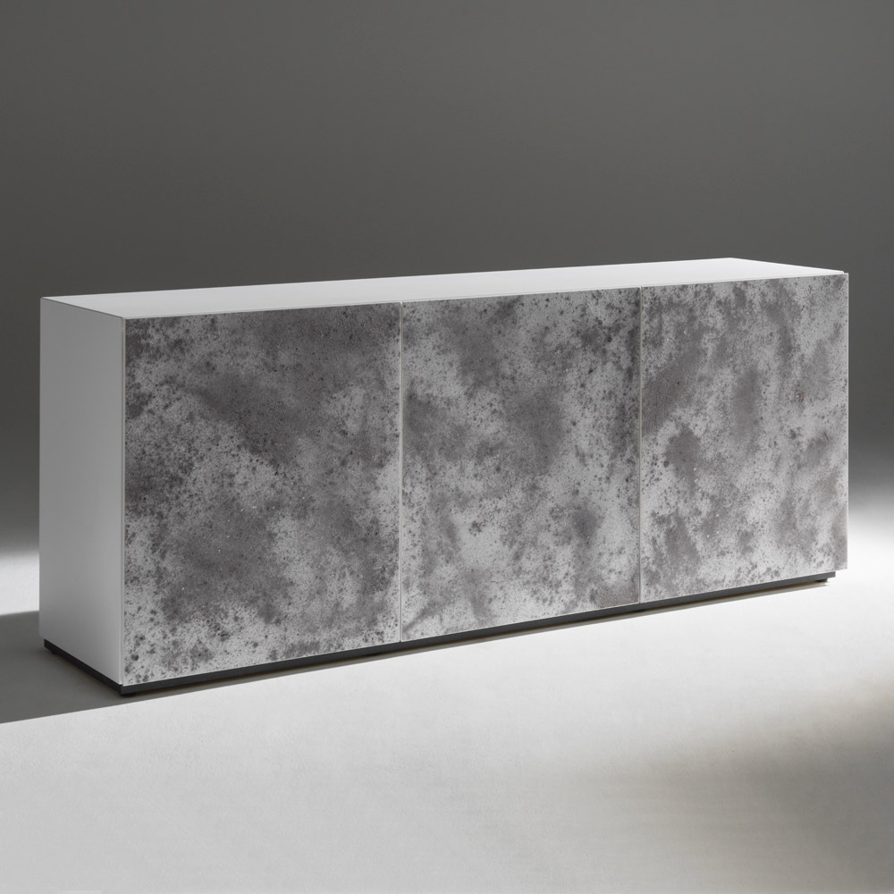 En skænk med et minimalistisk, moderne design med rene volumener og sofistikerede teksturerede overflader. Et dramatisk og funktionelt møbel, ideelt til stuer, spisestuer og kontorområder med et moderne, sofistikeret præg.