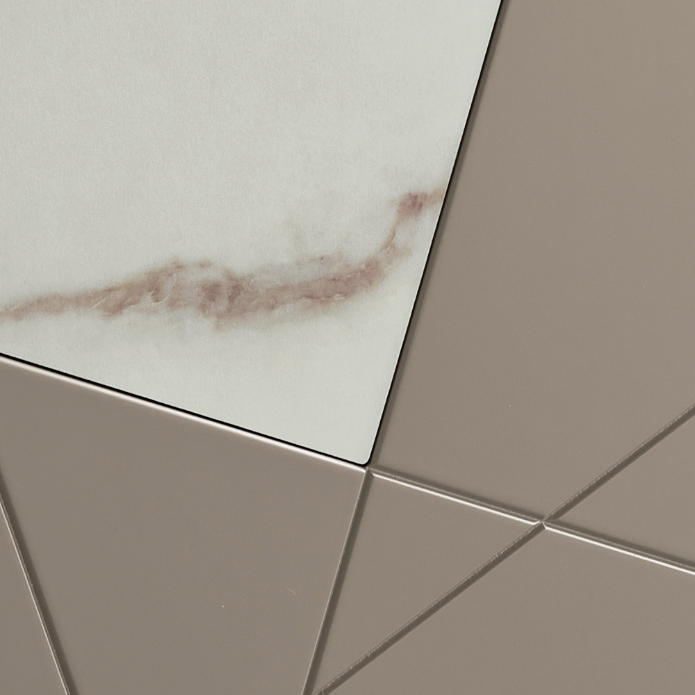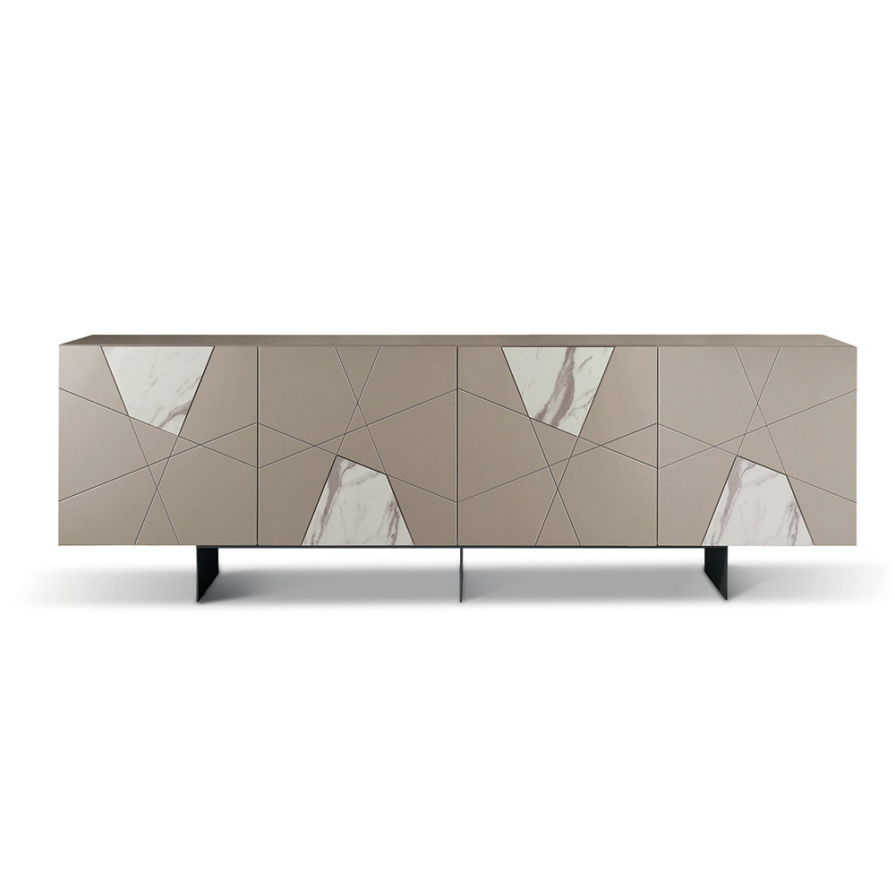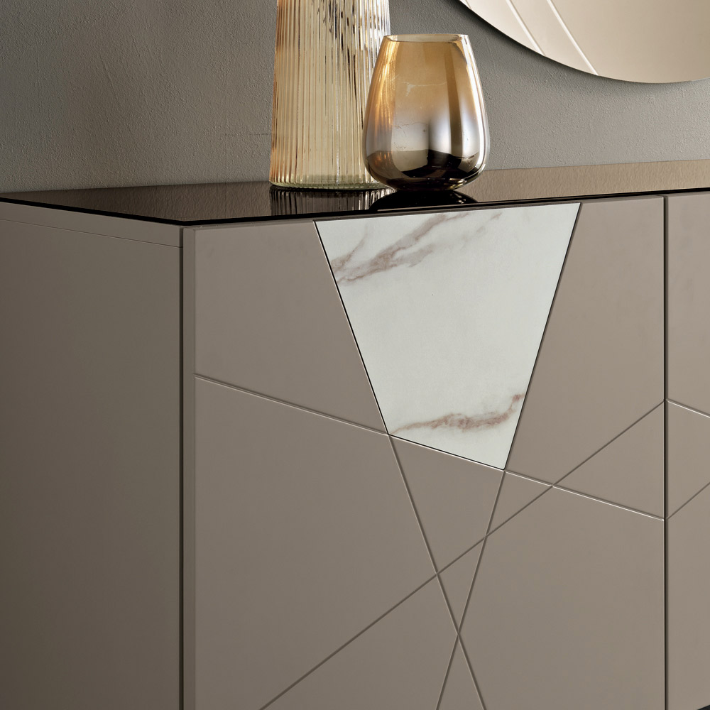 Strukturen er lavet af en melaminbelagt træskal, en spejlblank glasplade og pantograferede MDF-døre med dekorative graveringer, der flettes sammen i et elegant geometrisk design. Glasindsatser med marmoreffekt beriger overfladen og skaber et sofistikeret samspil mellem grafik og materialer.