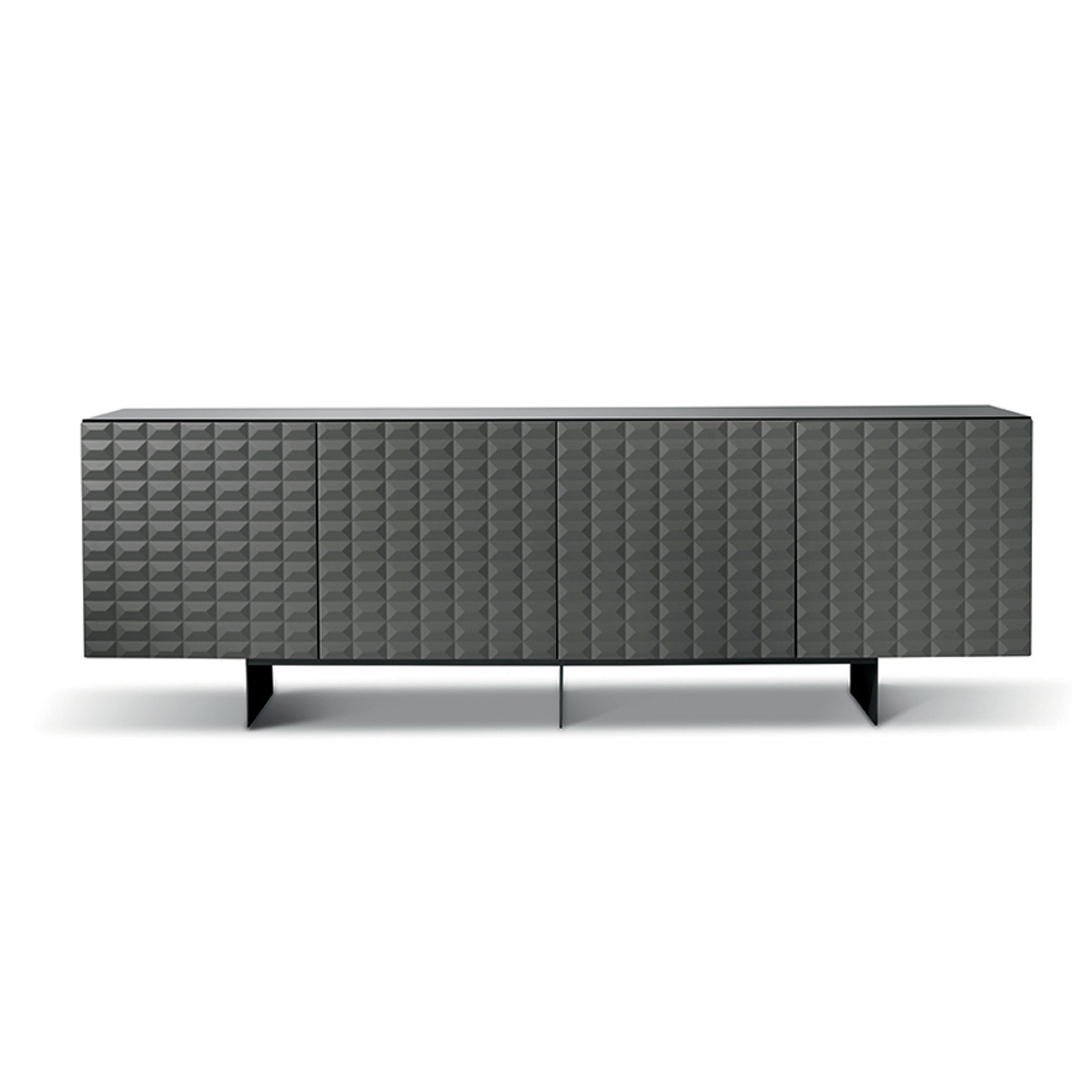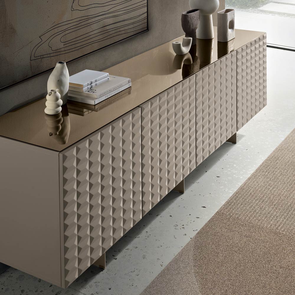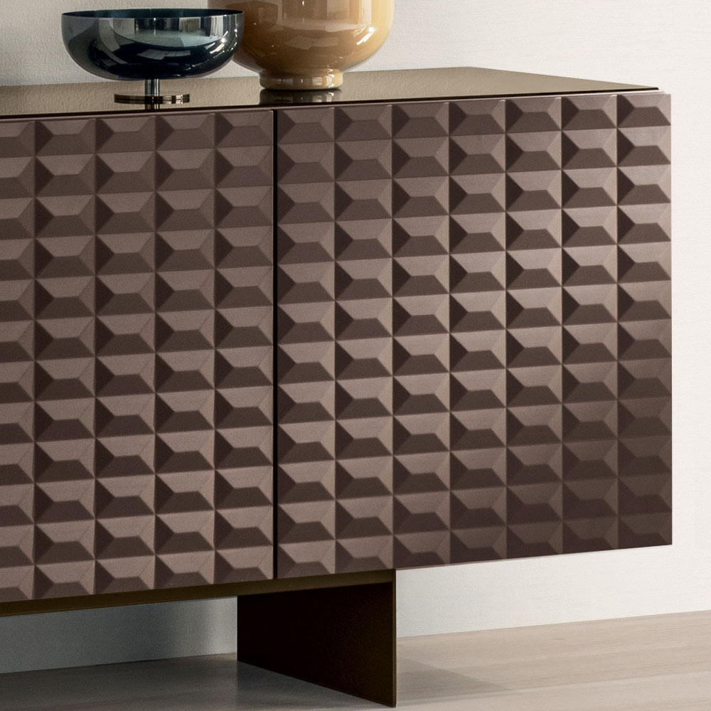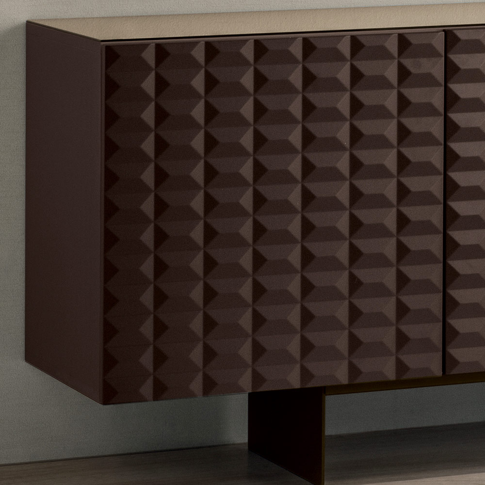 De PVC-belagte MDF-døre har en tredimensionel geometrisk tekstur, der minder om de berømte diamantformede relieffer, hvilket skaber et fascinerende samspil mellem lys og skygge. Denne detalje tilføjer visuel dybde og gør skænken til et sandt fokuspunkt i rummet.