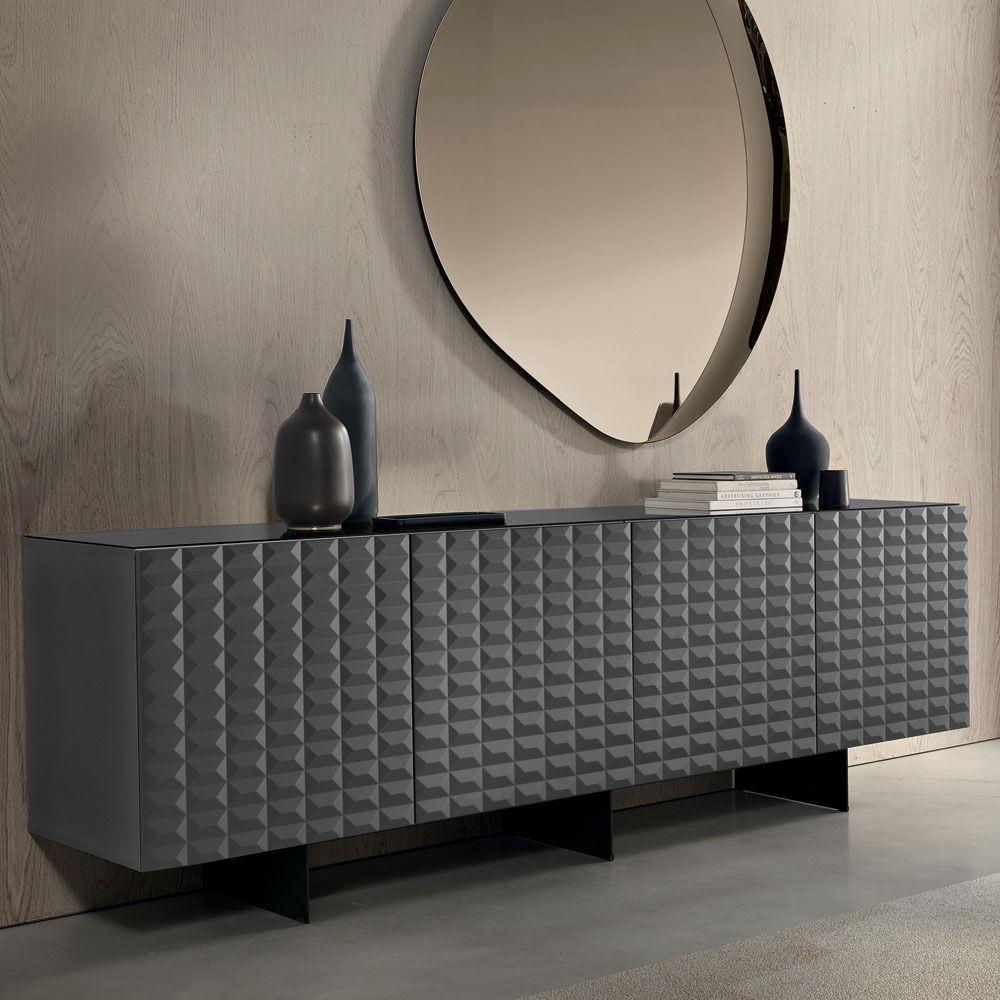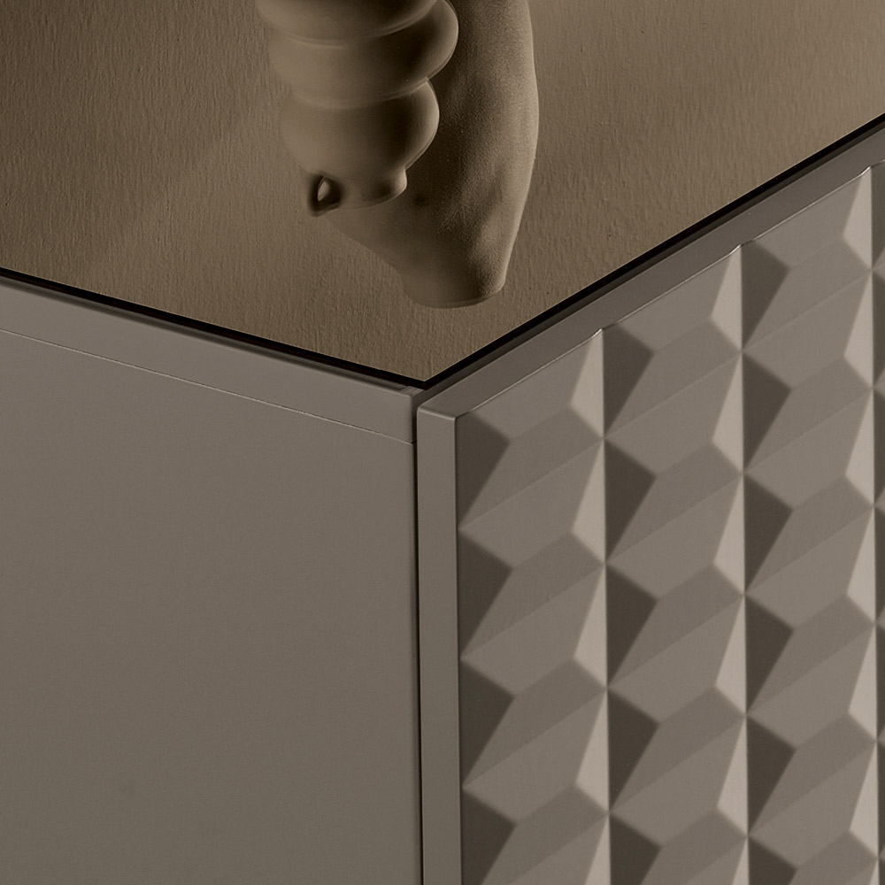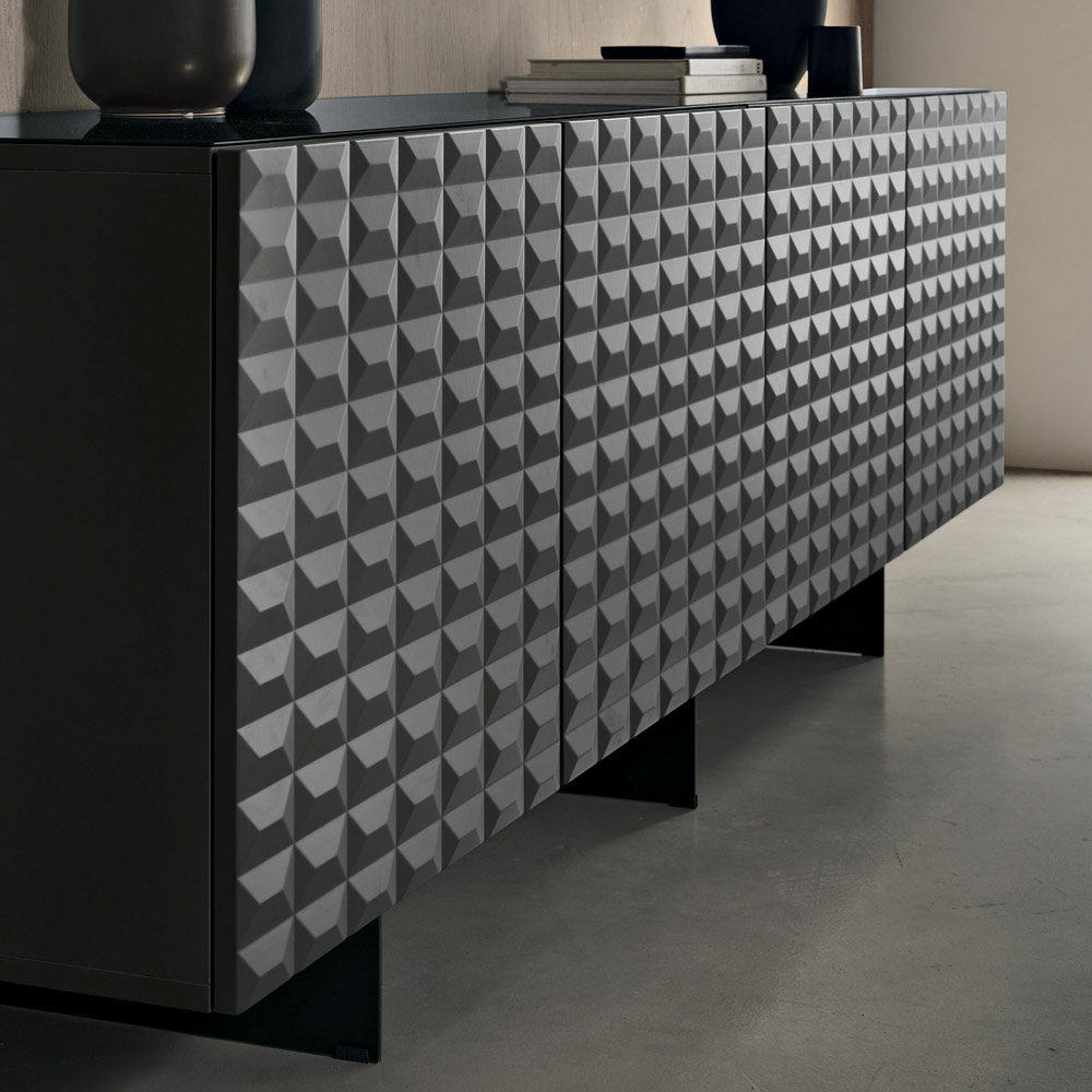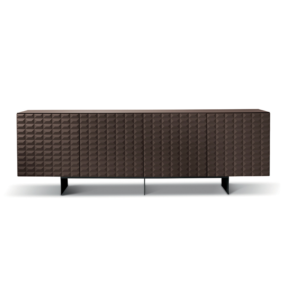 De PVC-belagte MDF-døre har en tredimensionel geometrisk tekstur, der minder om de berømte diamantformede relieffer, hvilket skaber et fascinerende samspil mellem lys og skygge. Denne detalje tilføjer visuel dybde og gør skænken til et sandt fokuspunkt i rummet.