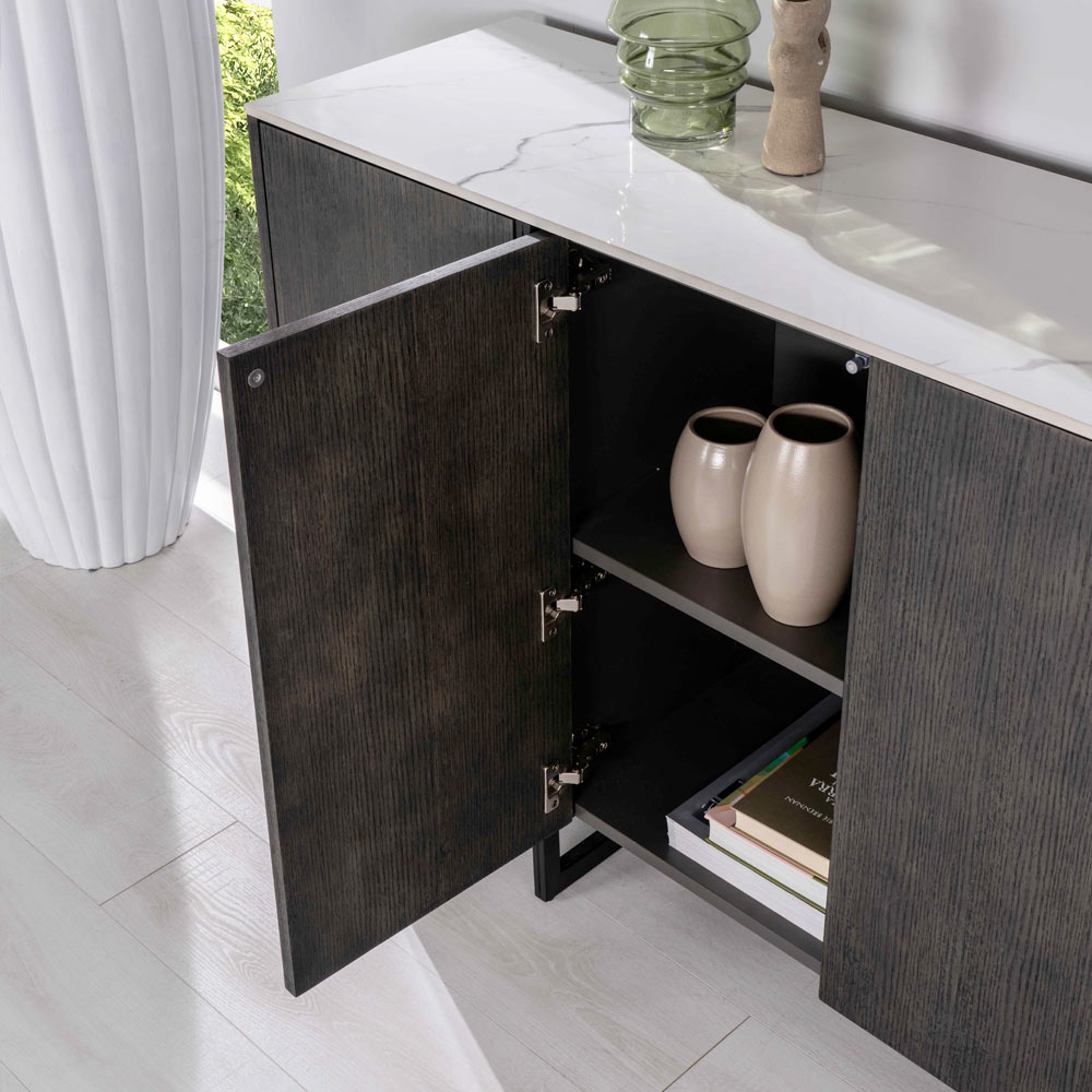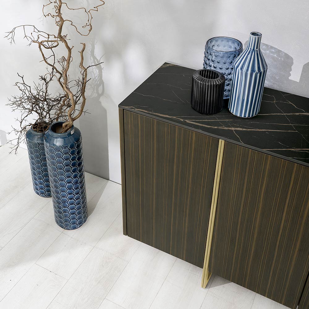 Indendørs skænk lavet med marmoreffekt keramisk top, fineret MDF struktur, metalben og 4 låger med push&pull system og blød lukning .