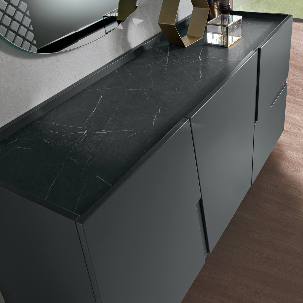 Strukturen er lavet med et melaminkorpus og lakerede MDF-døre , der skaber en ensartet og elegant overflade. Designet er udsmykket med dekorative indsatser og kontrasterende toppe , der fås i finish som marmorlook , teaklook eller bronzespejl , der tilføjer dybde og karakter til kompositionen.