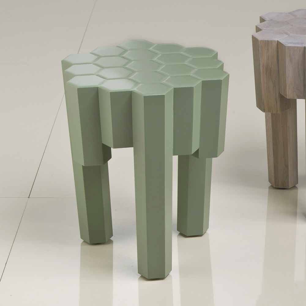 Skammel / ned træbord lavet af sekskanter. Tabeller karakteriseret ved fylden af massivt træ og en honeycomb konstruktion af honeycomb, at takket være de seks sider, gør dem egnede til at blive sat sammen og komponere flere systemer.