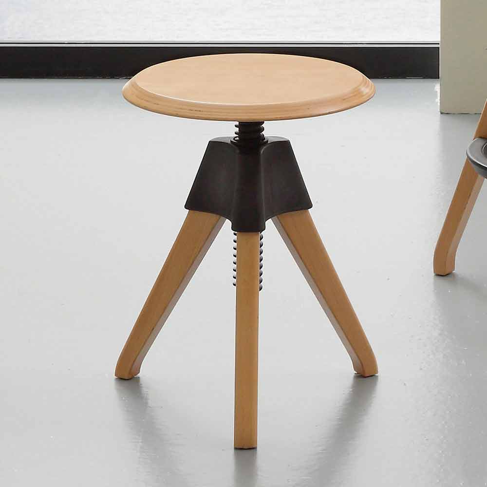 Moderne afføring lavet af massivt bøgetræ med sorte detaljer i polypropylen.