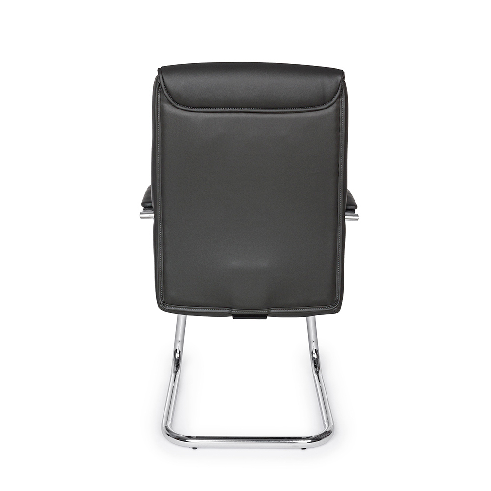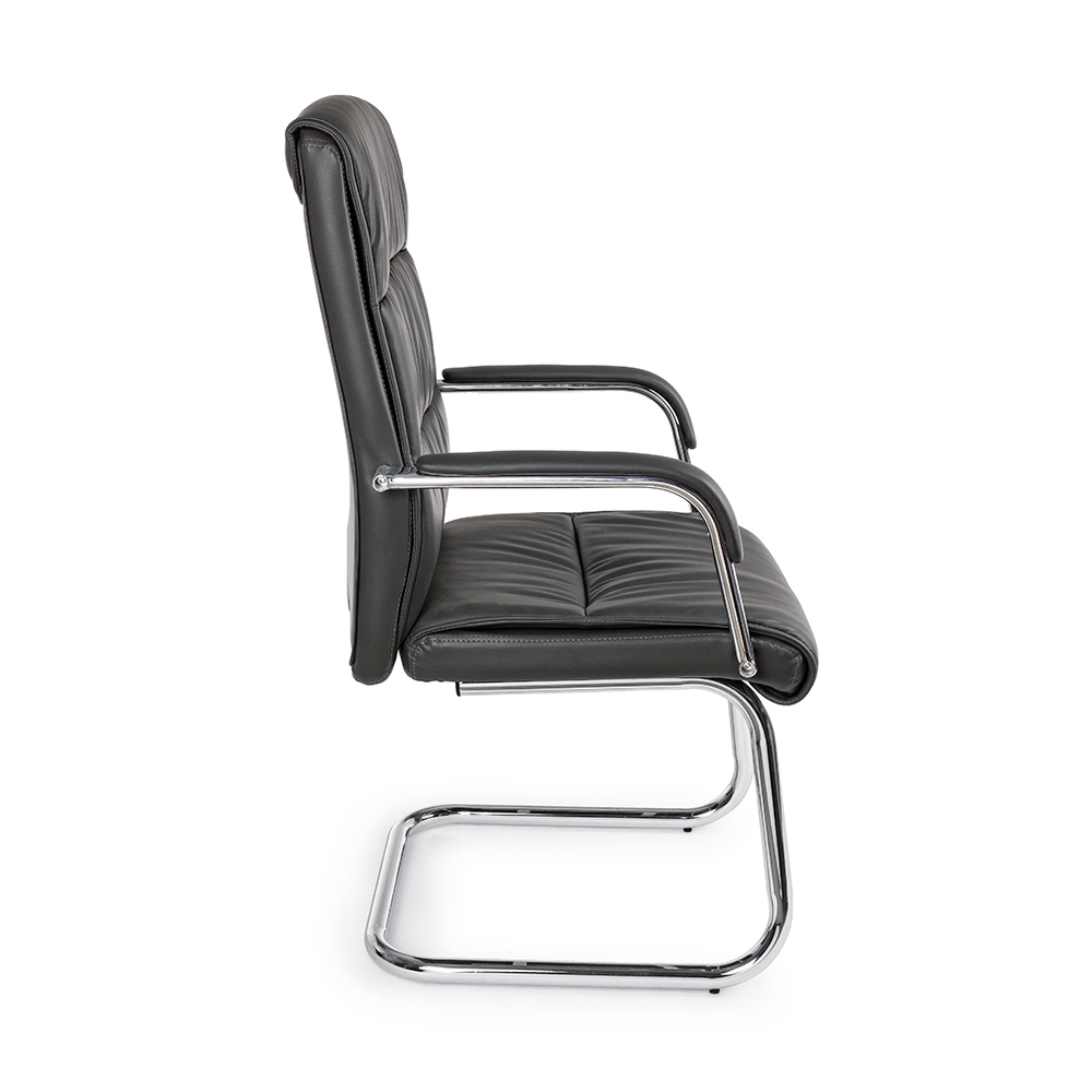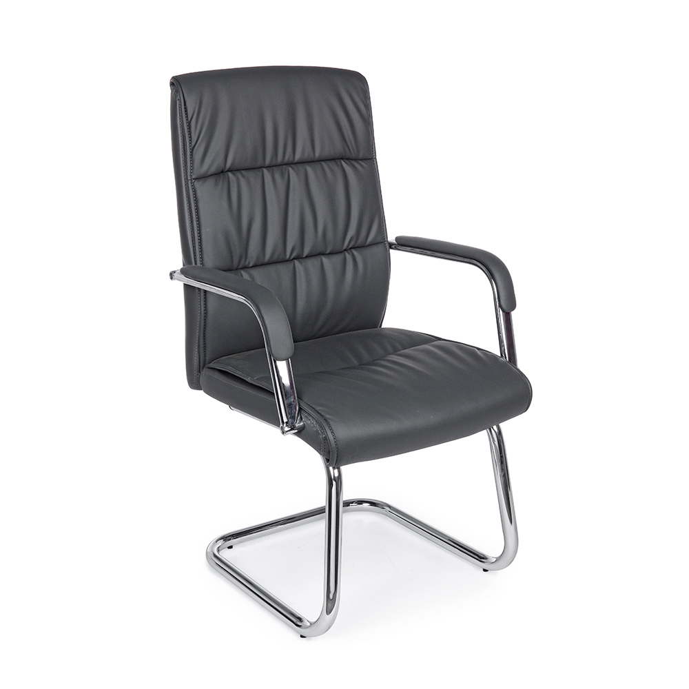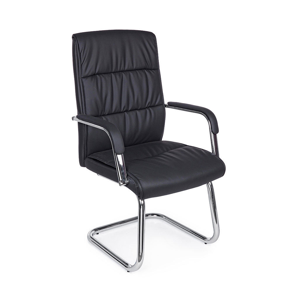 Denne kontorlænestol er lavet med en solid forkromet stålbund og polstret sæde og ryg betrukket med imiteret læder . Armlæn i forkromet stål med betræk af imiteret læder. Design til at samle.