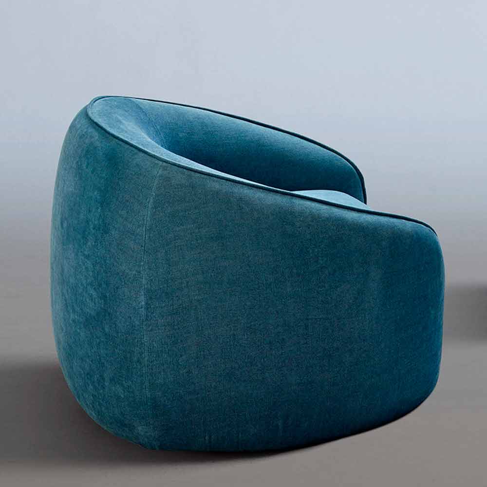 Moderne afslapningslænestol i orange eller luftvåbenblå, luksusdesign med runde former lavet i Italien.