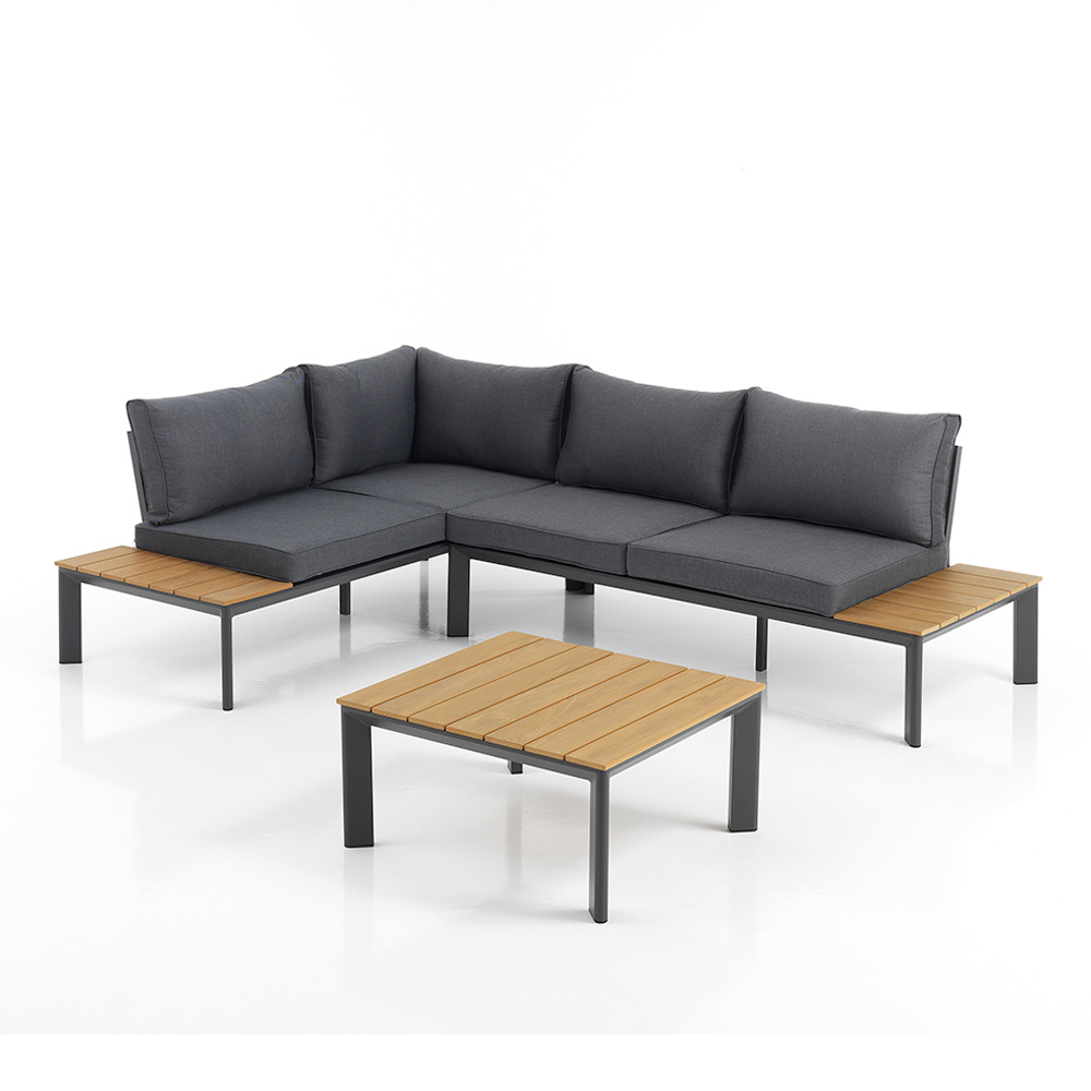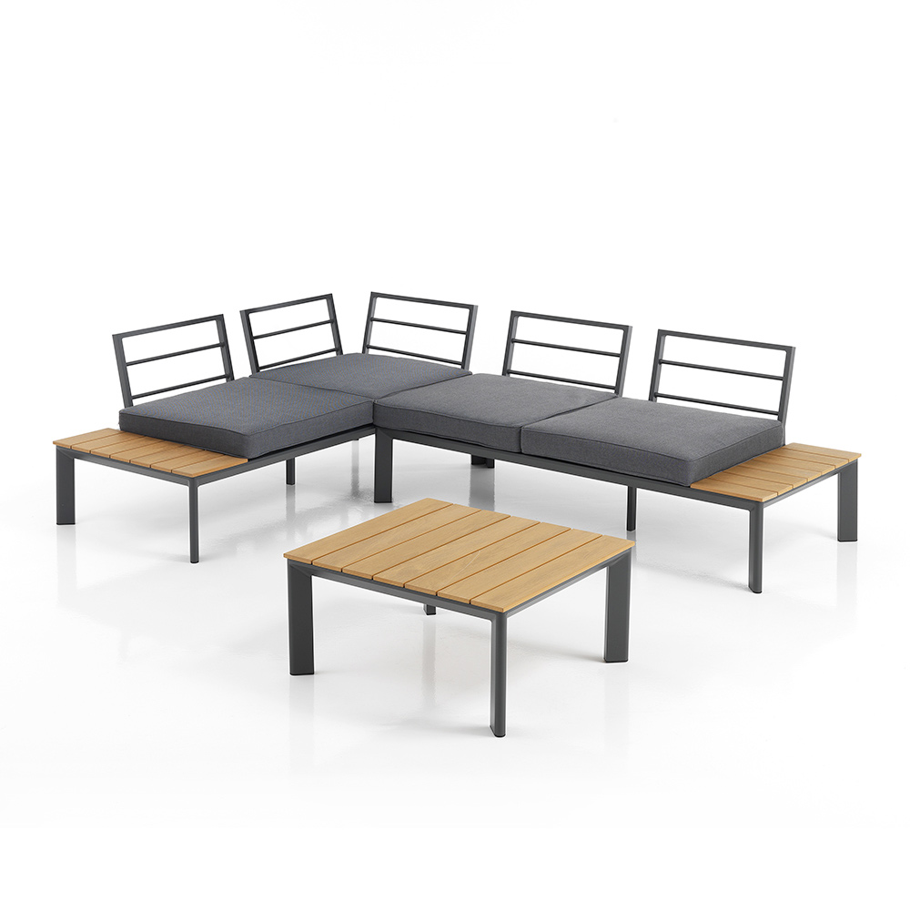 Denne havelounge med sofabord inkarnerer overkommelig luksus og alsidigt design . Den unikke kombination af aluminium og polywood tilbyder en slank, moderne æstetik, der passer problemfrit ind i både moderne og traditionelle rum. De grå polyesterpuder giver ikke kun sublim komfort, men tilføjer også et strejf af sofistikeret enkelhed til sættet.