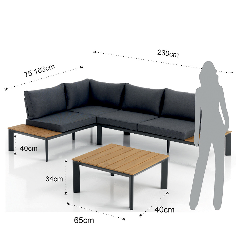 | Foranstaltninger | sofa: 230x75/163x76 cm / sofabord: 65x40x34 cm |