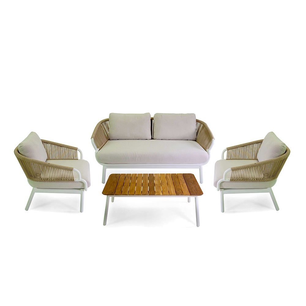 Bring friskhed og elegance fra moderne design til dit udendørs rum med vores have loungesæt , perfekt til dem, der ønsker at kombinere stil og komfort . Dette sæt består af en trepersoners sofa, to lænestole og et sofabord med en top af teaktræ, alle med et hvidt pulverlakeret aluminiumsstel, der garanterer holdbarhed og modstandsdygtighed over for vejrforhold.
