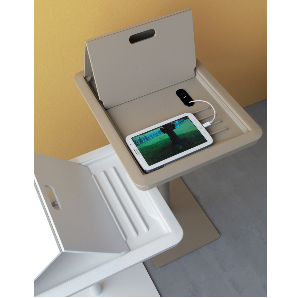 metalbund og en pvc-top i samme farve, der kan åbnes og moduleres. Den er udtænkt og designet til tabletstøtte, med et