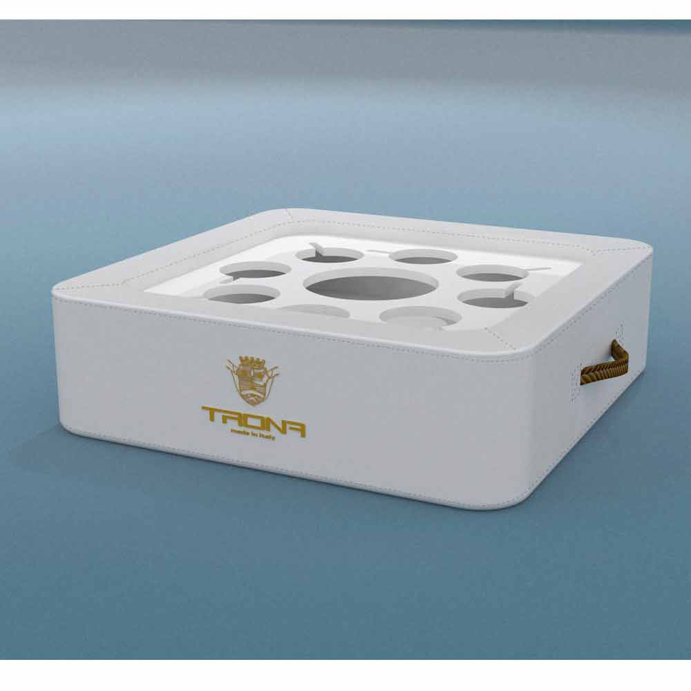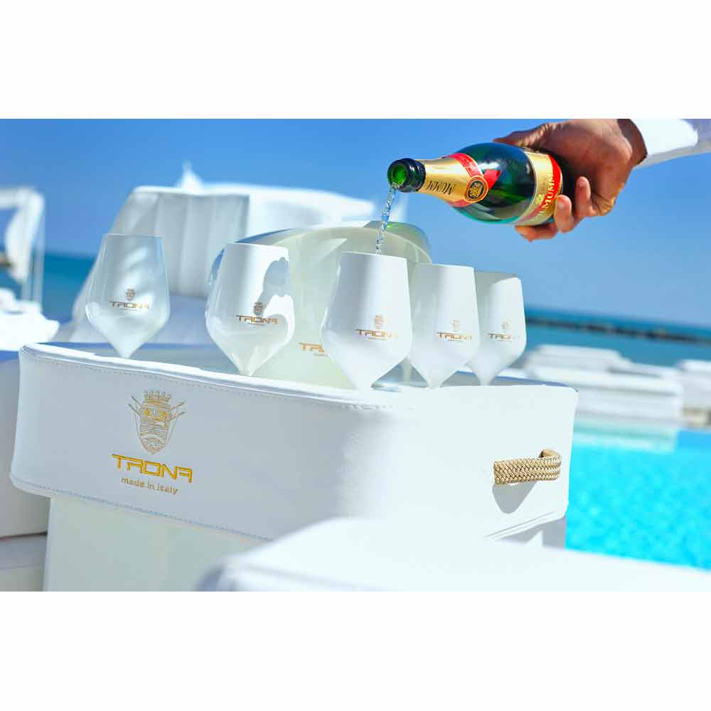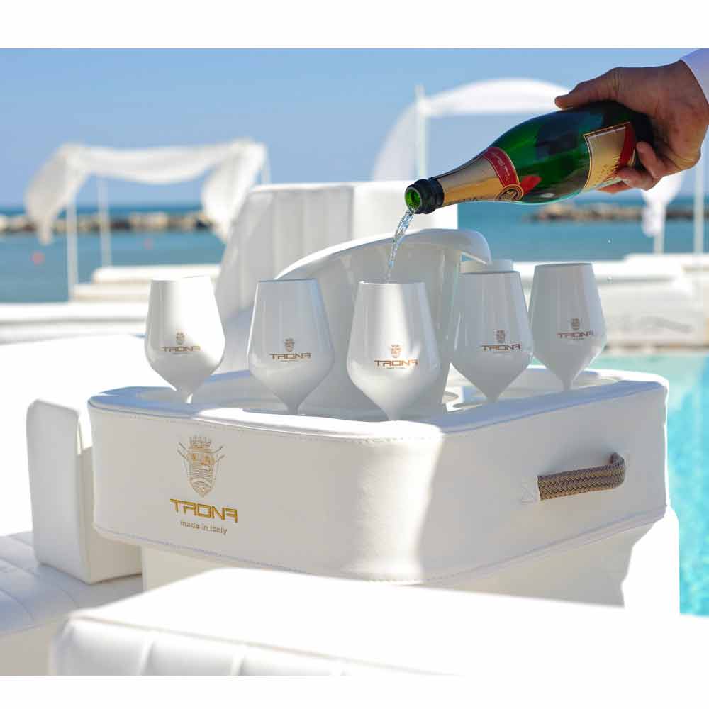 Den særlige plade perforeret plexiglas, Trona argumenterer flaske, isspand og briller sikkert, uden risiko for kæntring. Trona i virkeligheden har et centralt hul som portaghiaccio / flaskeholder og 8 huller egnede til at bringe vin briller eller cocktail.