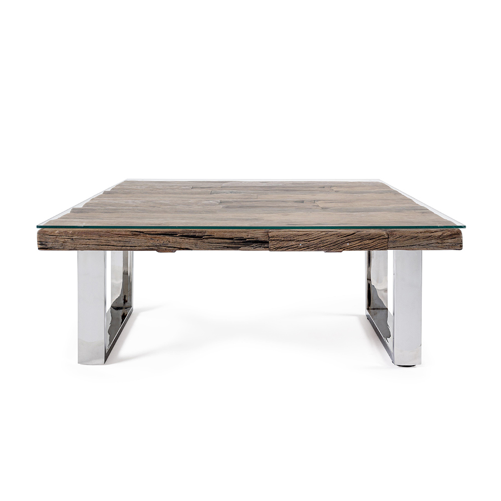 Dette sofabord er lavet med en naturlig finish genbrugstræ plade og hærdet glas med rustfrit stål ben til at samle.