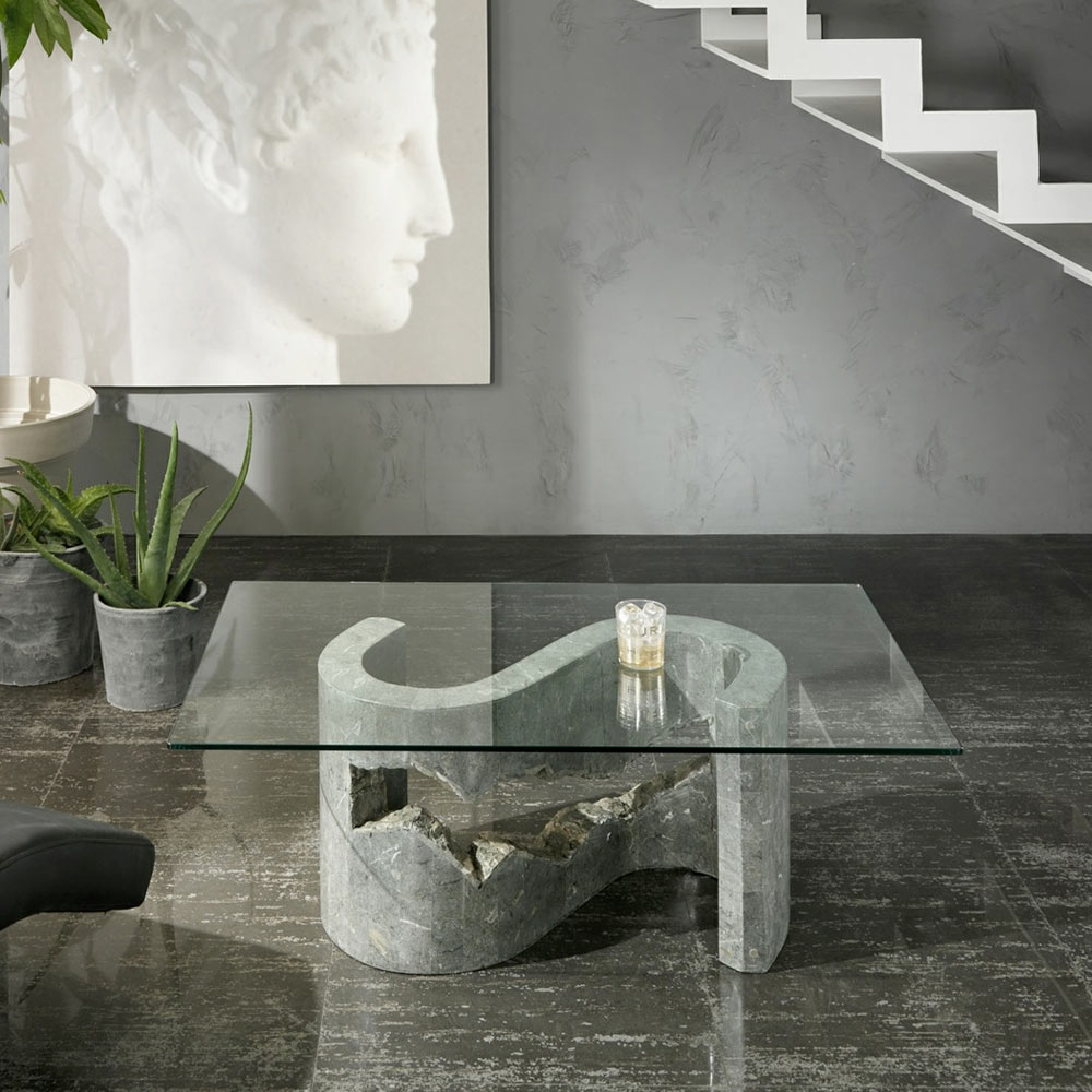 Sofabordet er udstyret med en 10 mm poleret kant glasplade og en grå finish fossil sten base, som præsenterer et originalt og elegant design.