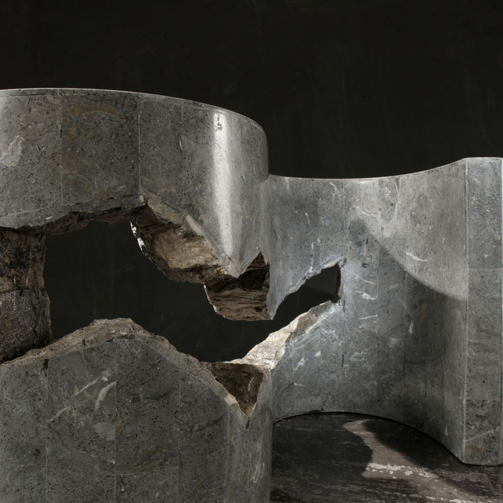 Den fossile sten er skåret i hånden, i form af små fliser, af dygtige håndværkere, der efterfølgende påfører dem én ad gangen, som om de komponerede en mosaik på en marine krydsfinerstruktur eller på en glasfiberform.