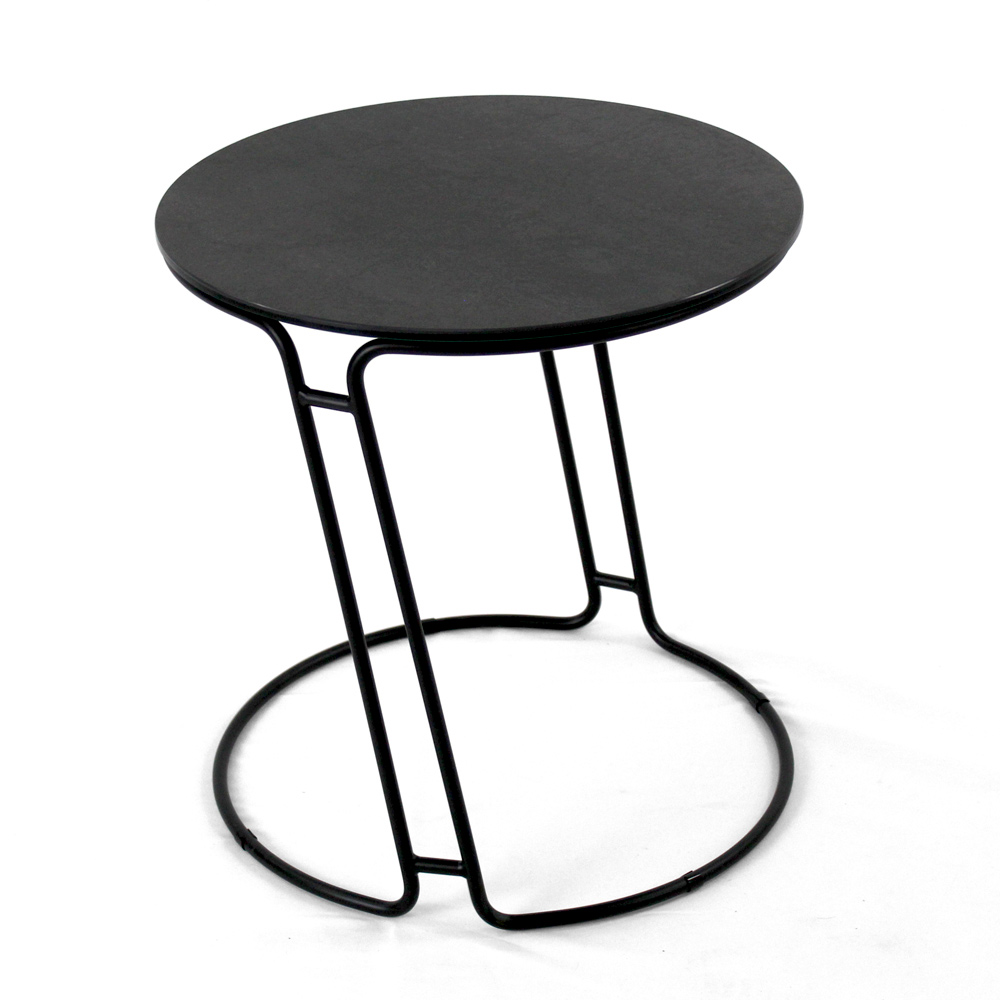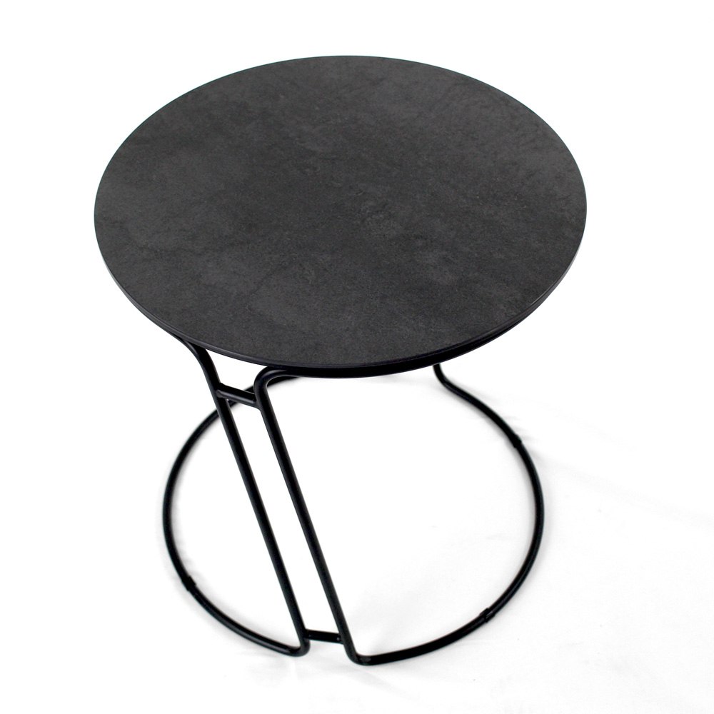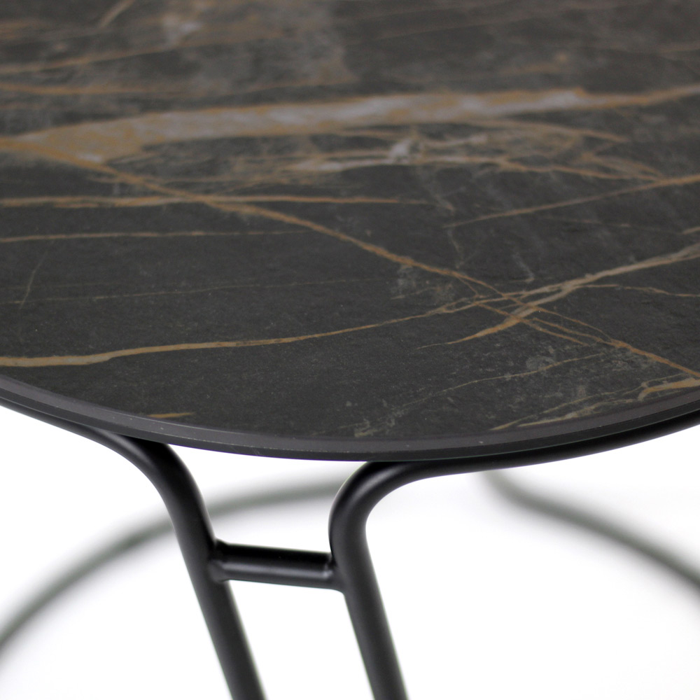 Rundt sofabord med understel af malet stål og top af porcelæn i stentøj.