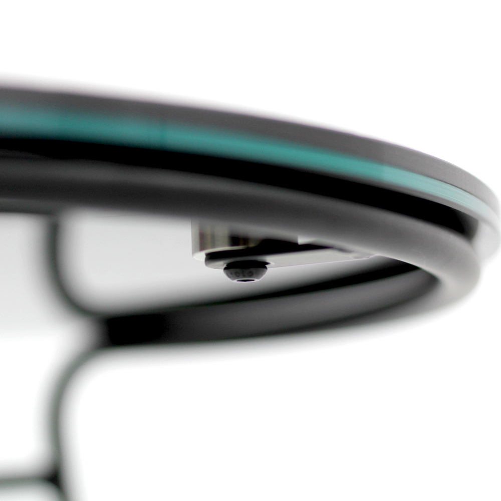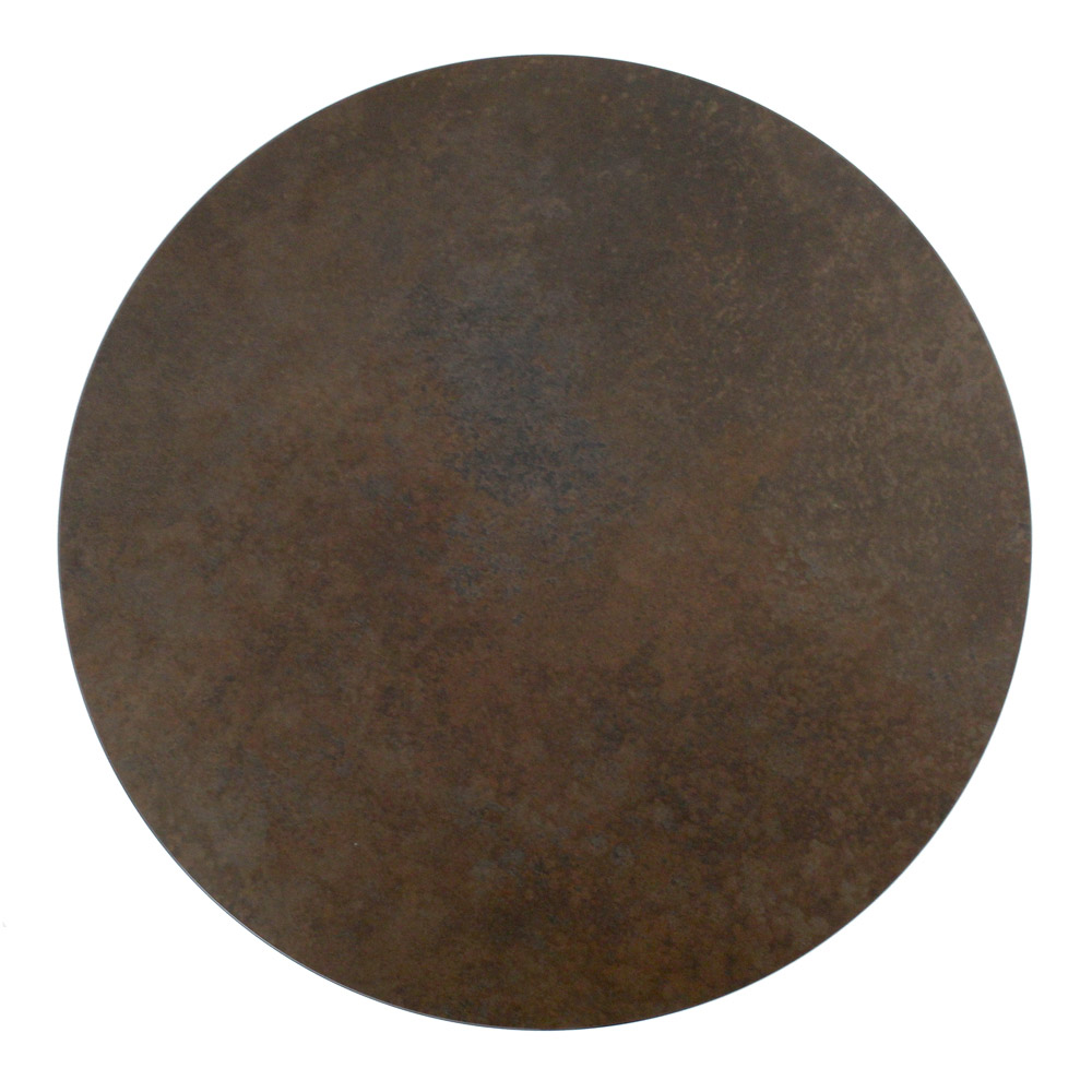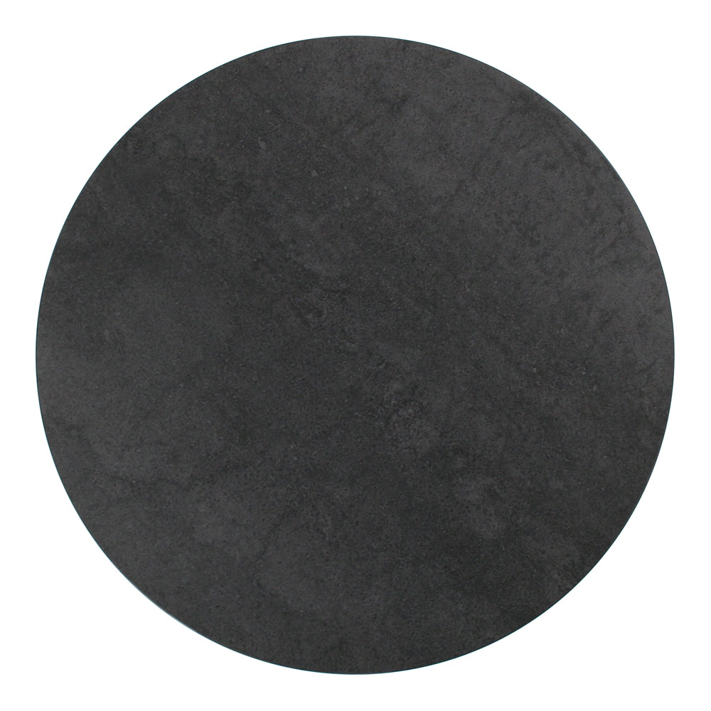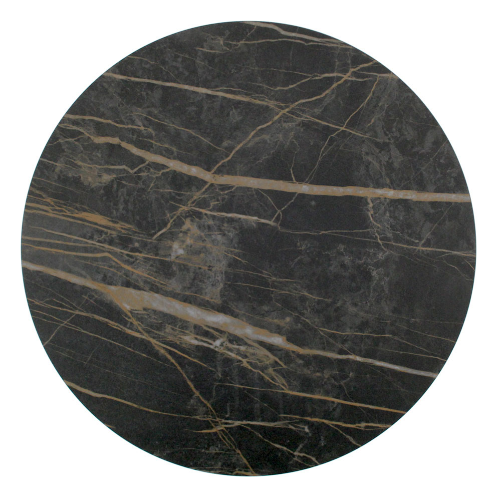 Rundt sofabord med understel af malet stål og top af porcelæn i stentøj.