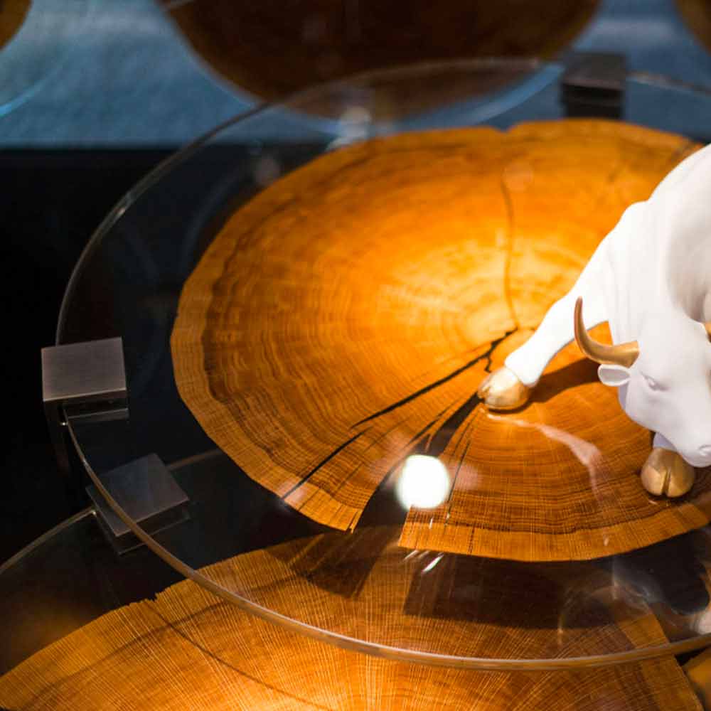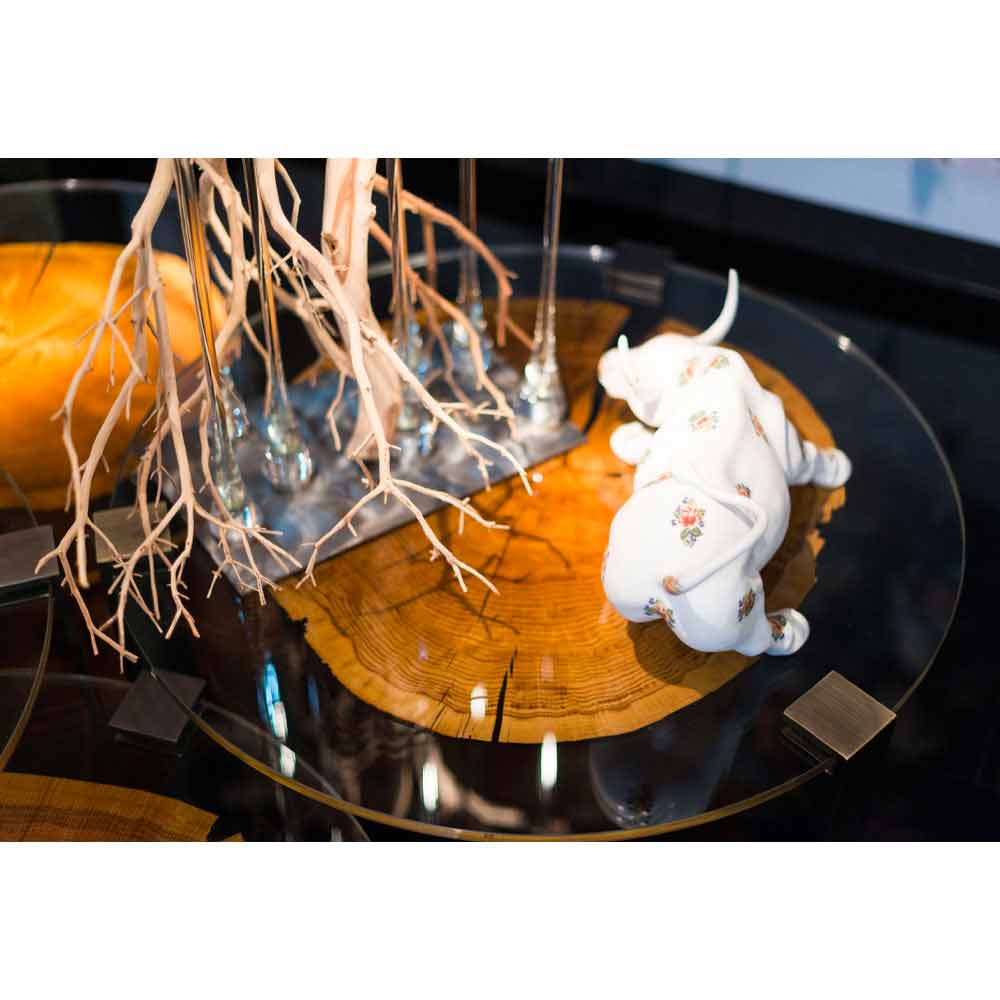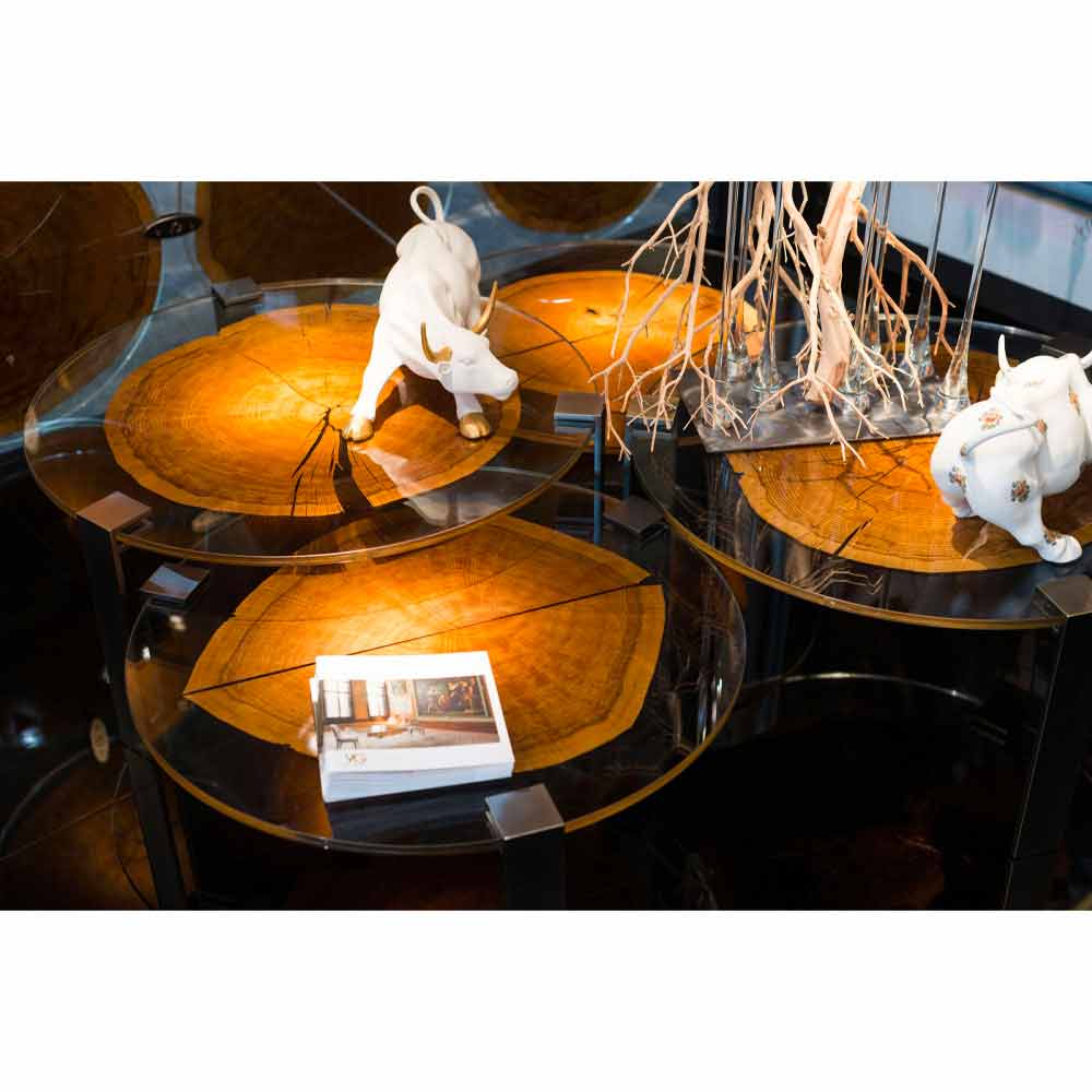 Sofabord fremstillet i Italienmed rund top i koblet glas (5 + 5 mm), hvori en tynd sektion af endeskåret træ er indsat, understøttet af 3 metalben med poleret messingfinish . Fra den eksklusive kombination af det raffinerede strejf af glas, de vidunderlige farver i træ og den moderne æstetik i metal, fødes en unik møbleløsning, der baserer sin idé på begreber innovation og elegance til et avantgardistisk resultat med en stærk personlighed. moderne . Dens styrke er repræsenteret af den perfekte kombination af overflader og materialer, der øger værdien af sofabordet uden nogensinde at overse det grundlæggende funktionelle aspekt, der understreges af 100% Made in Italy-håndværket og brugen af kvalitetsråmaterialer, hvilket gør det muligt at tilbyde et møbleringstilbehør med en revolutionerende skønhed og samtidig særligt solid og modstandsdygtig .