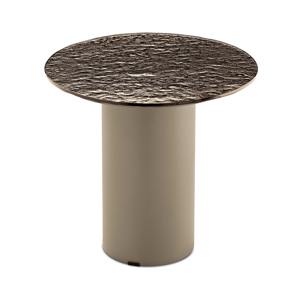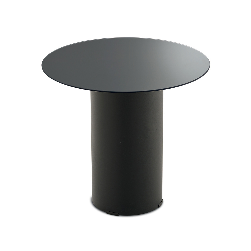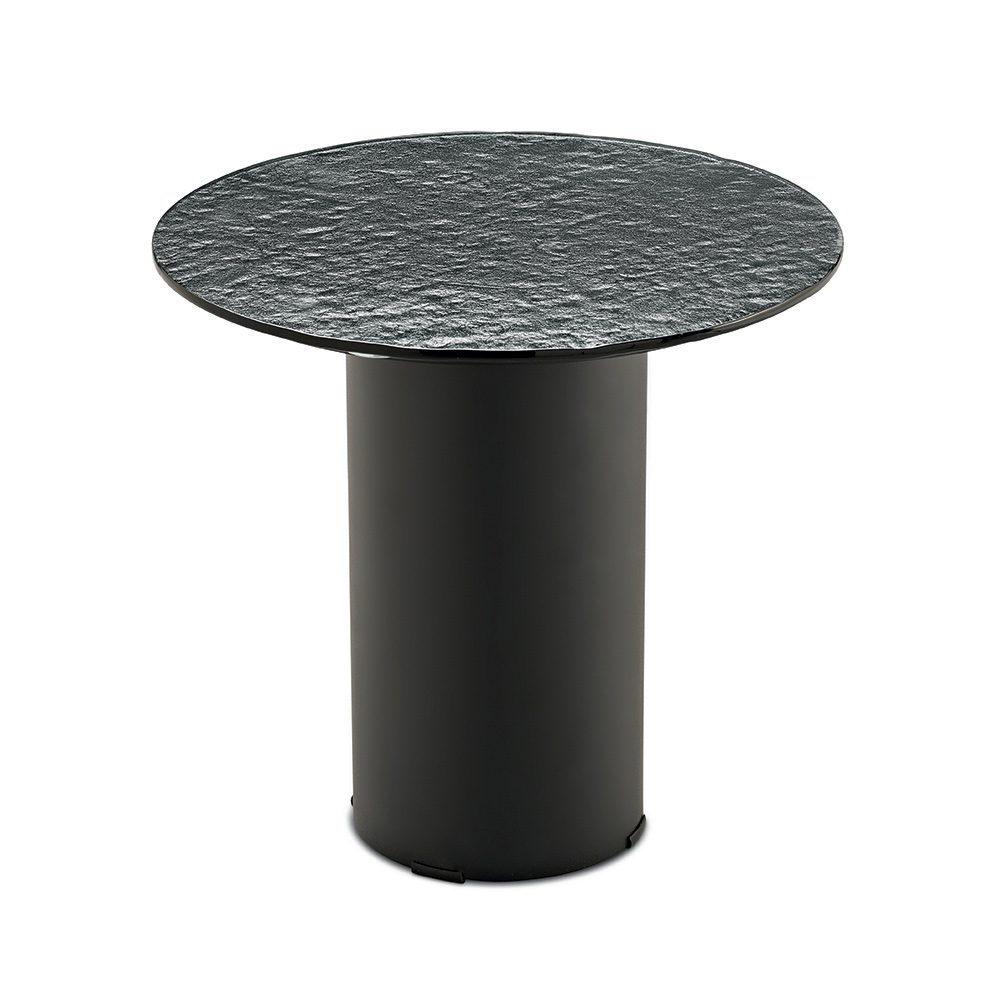 Strukturen har en cylindrisk, malet metalbase , der er solid, men visuelt let, og som balancerer toppen. Denne kontrast mellem solide volumener og tynde overflader skaber en moderne og elegant æstetik, perfekt til sofistikerede rum.