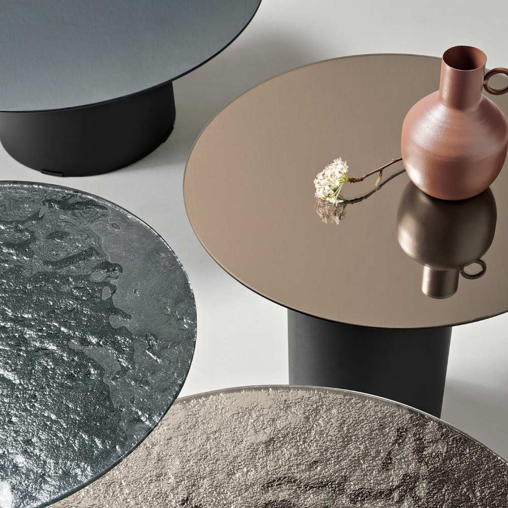 Bordpladen fås i forsølvet, hamret glas med bagside eller glat spejl , begge løsninger designet til at reflektere lys og forbedre rummet med karakteristiske visuelle effekter. Muligheden for at kombinere finish og farver giver dig mulighed for at tilpasse bordet, så det passer til din stil.
