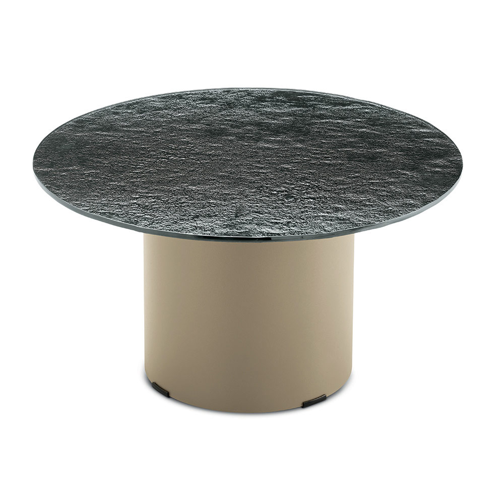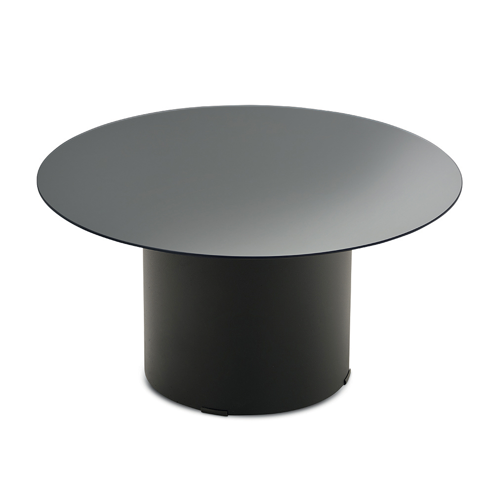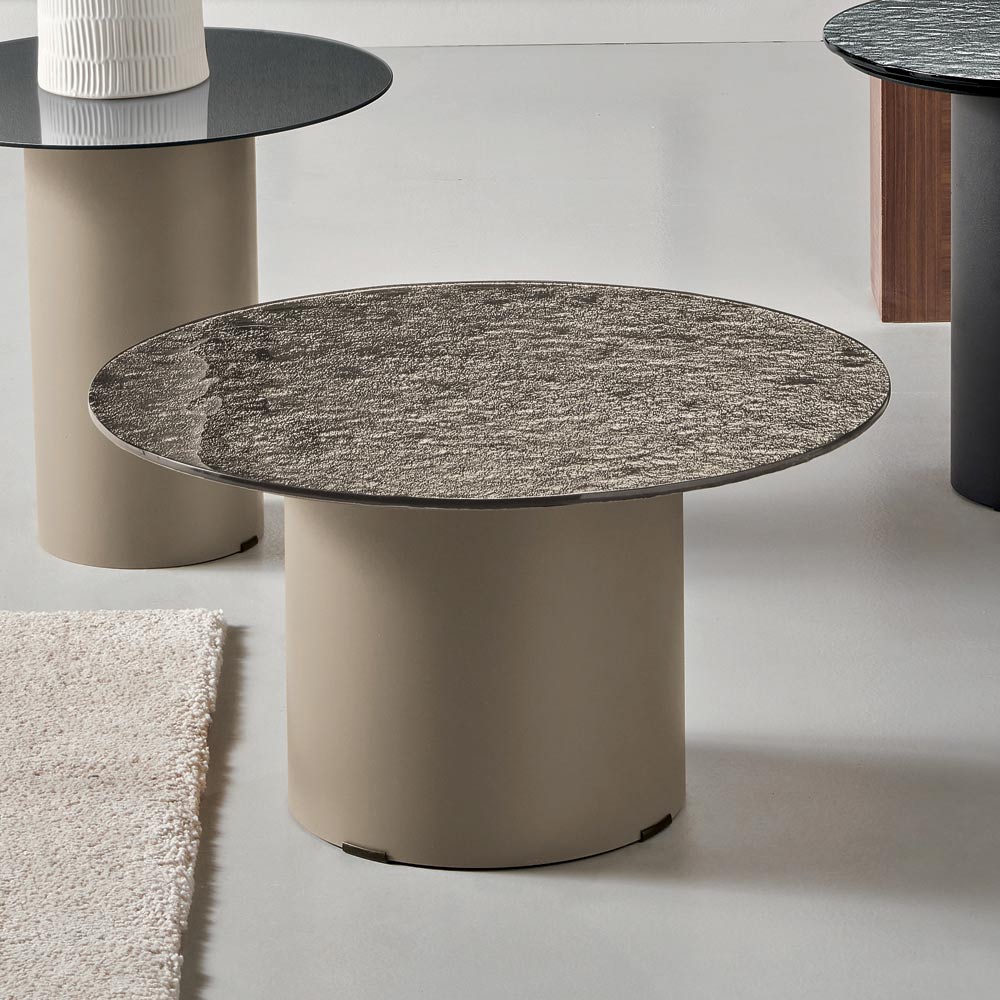 Strukturen har en cylindrisk, malet metalbase , der er solid, men visuelt let, og som balancerer toppen. Denne kontrast mellem solide volumener og tynde overflader skaber en moderne og elegant æstetik, perfekt til sofistikerede rum.