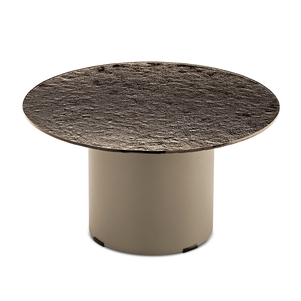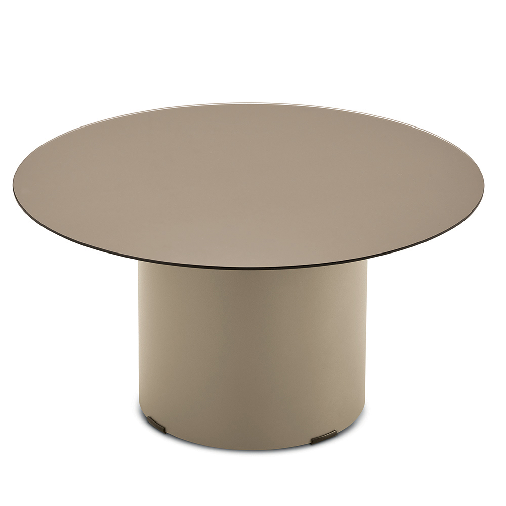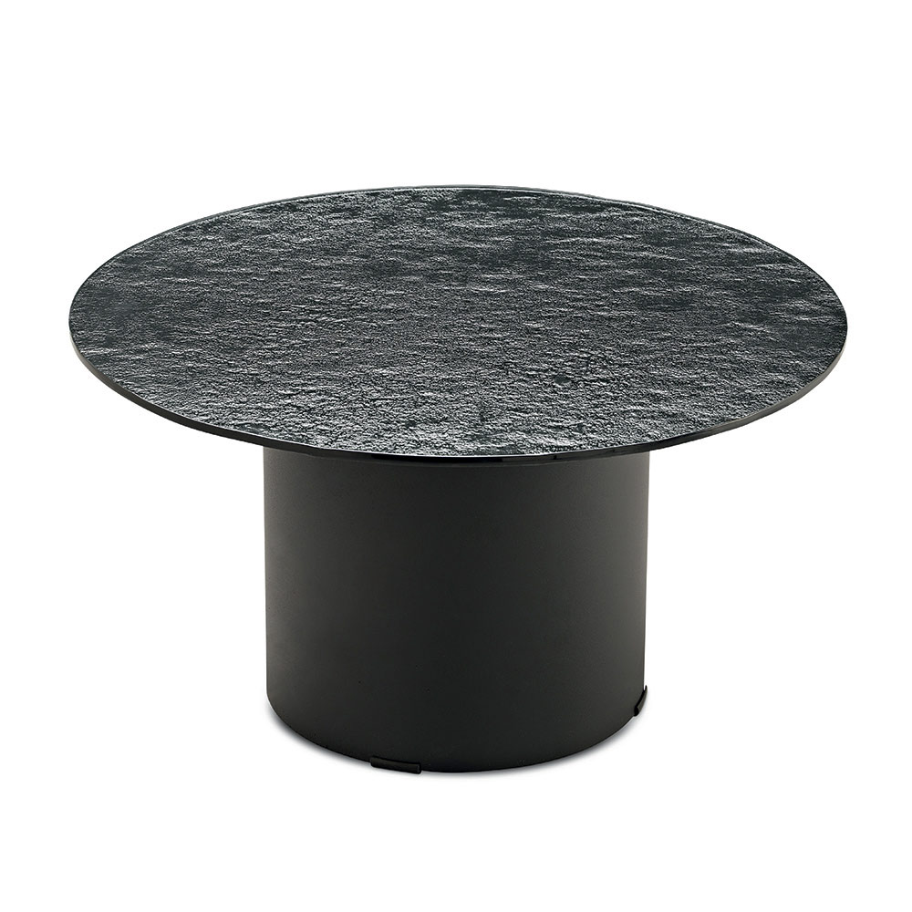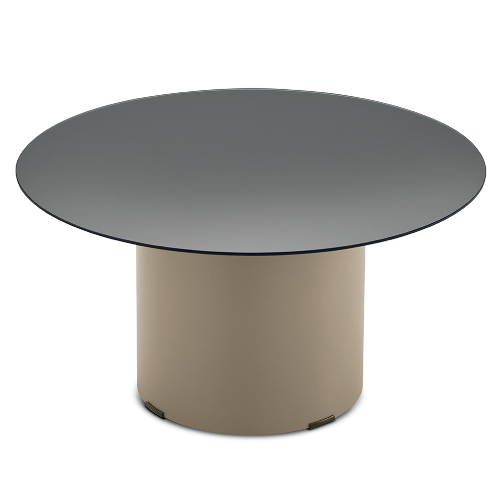 Strukturen har en cylindrisk, malet metalbase , der er solid, men visuelt let, og som balancerer toppen. Denne kontrast mellem solide volumener og tynde overflader skaber en moderne og elegant æstetik, perfekt til sofistikerede rum.
