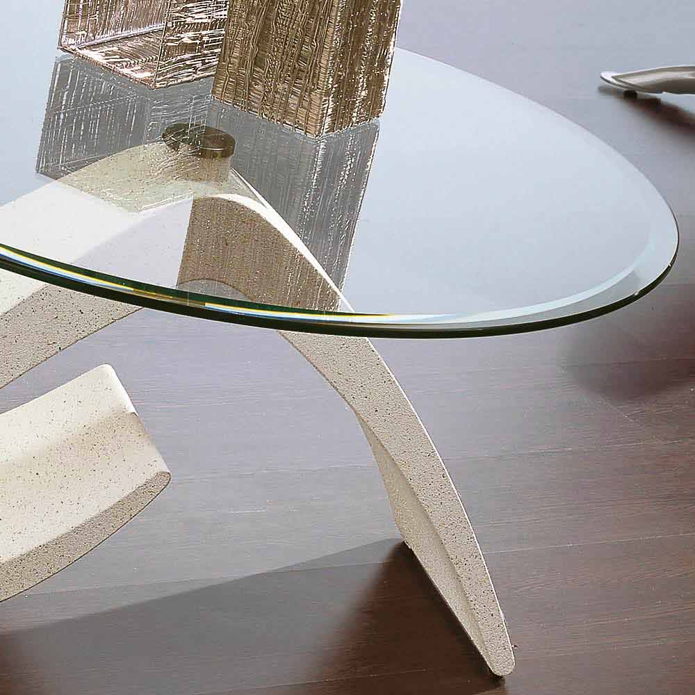 Sofabord fremstillet i Italien med rund plade i affaset gennemsigtigt glas og bund i mineralsk marmor , et materiale opnået ved at blande marmorpulver. Et eksklusivt og elegant design kendetegner dette møbel med en stærk raffineret personlighed , ideel til at indrette ethvert boligrum med karakter, hvilket bringer et avantgarde-præg med sig. Takket være brugen af råmaterialer af høj kvalitet og 100% Made in Italy håndværket, er et dyrebart og værdifuldt sofabord født, der skiller sig ud for sin elegance og kreativitet i formerne. Understellet i mineralsk marmor giver sofabordet fremragende soliditet og robusthed samt giver æstetikken dens stærke moderne stil. Dens særlige figur præget af enkle geometriske linjer skaber en vidunderlig harmoni med glaspladens bløde form, hvilket giver produktdesignet en eksklusiv æstetisk sans.