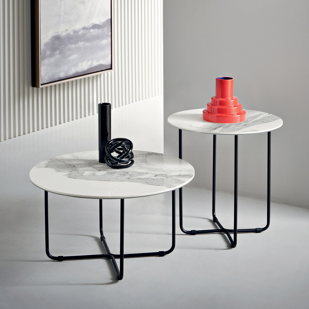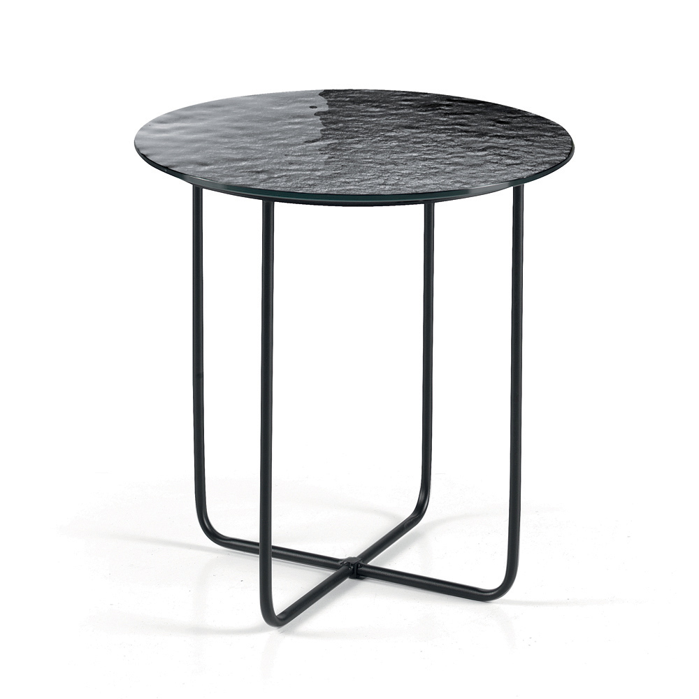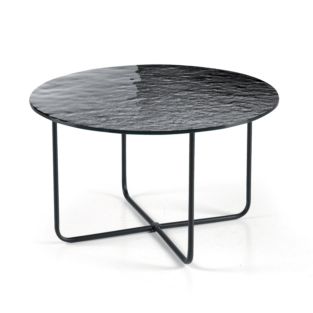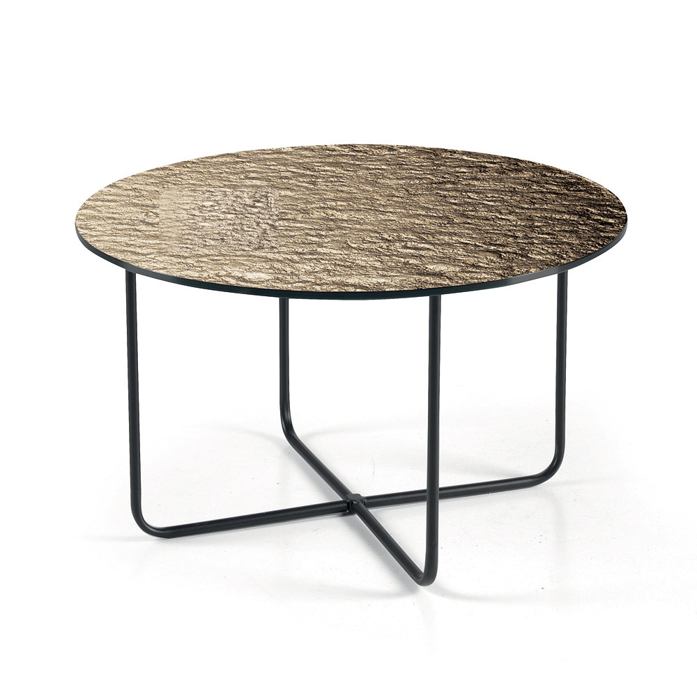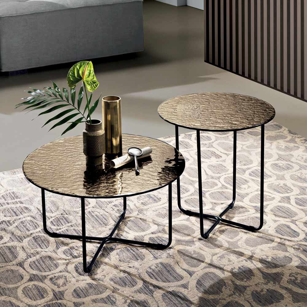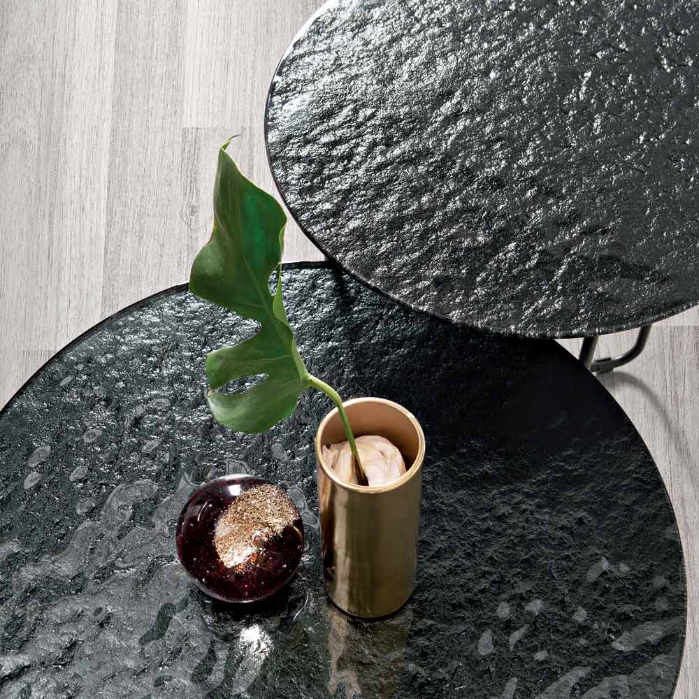 Bordpladen fås i forsølvet, hamret glas med bagside , som forstærker rummets lysstyrke, eller i marmorlignende keramik oven på glas , en løsning, der kombinerer holdbarhed og æstetisk raffinement. Denne dobbelte mulighed giver dig mulighed for at tilpasse bordet, så det passer til rummets stil.