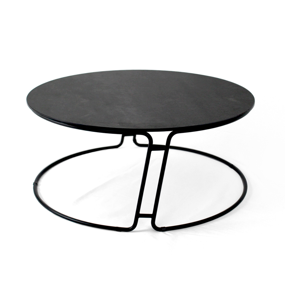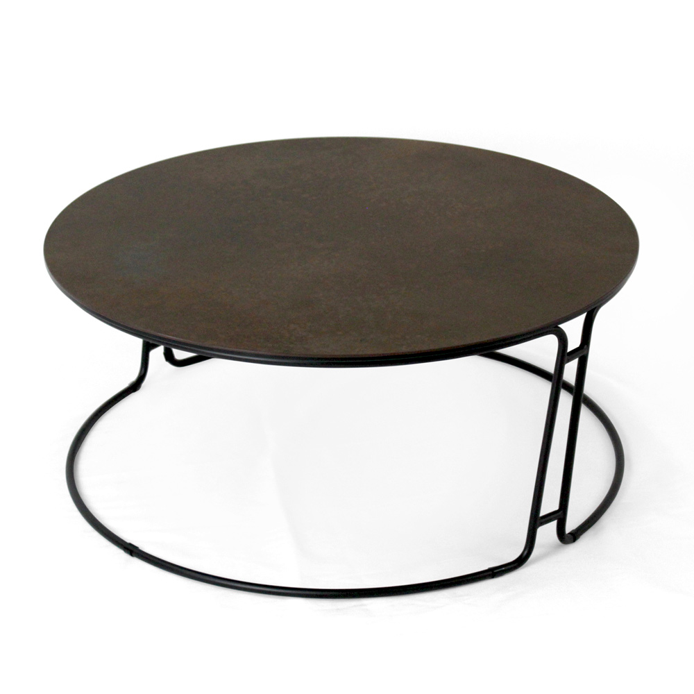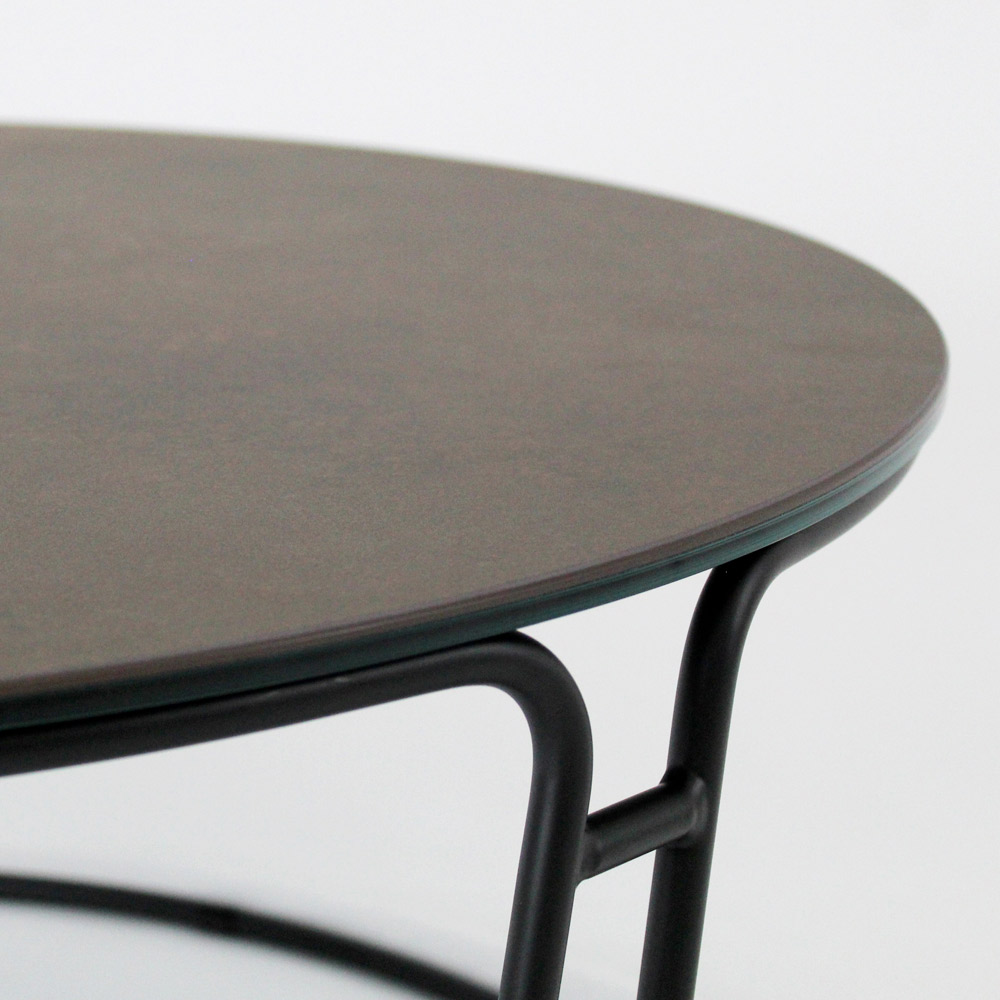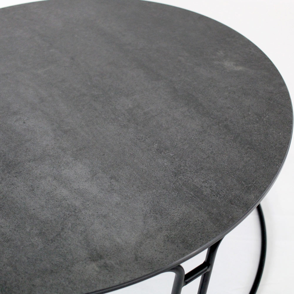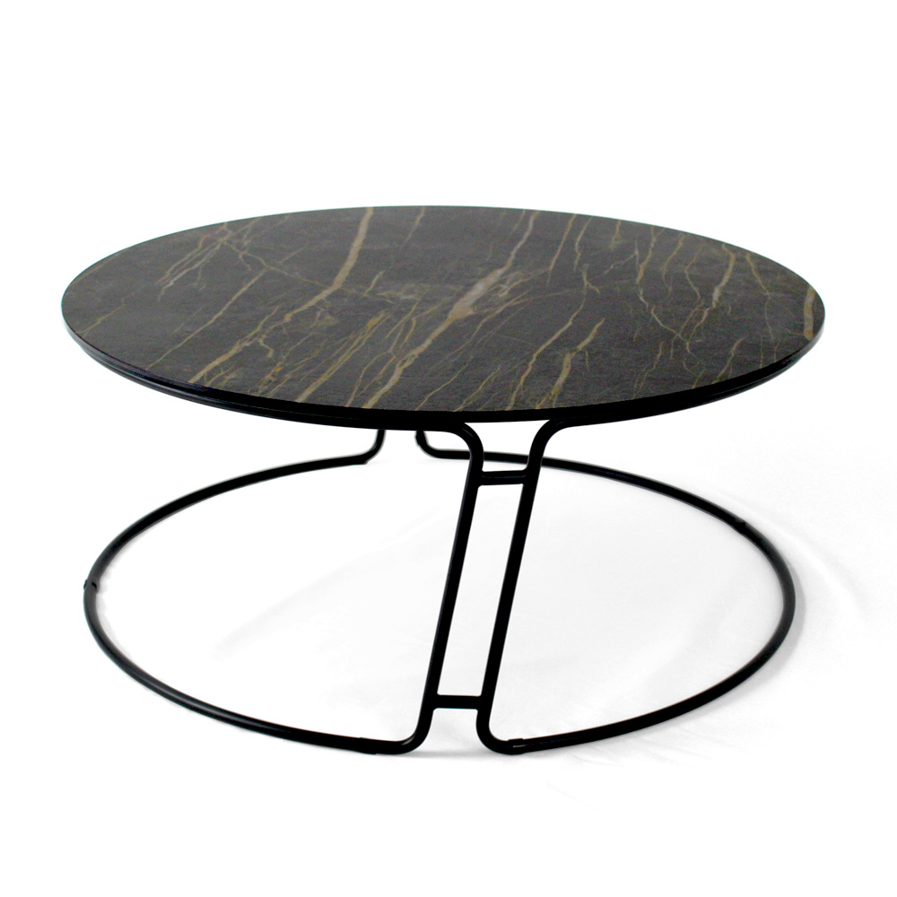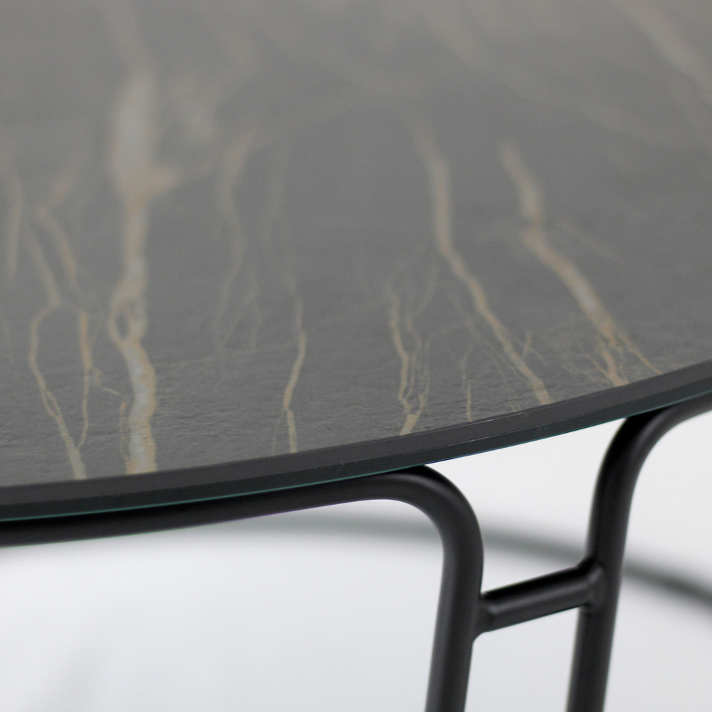 Rundt sofabord med understel af malet stål og top af porcelæn i stentøj.