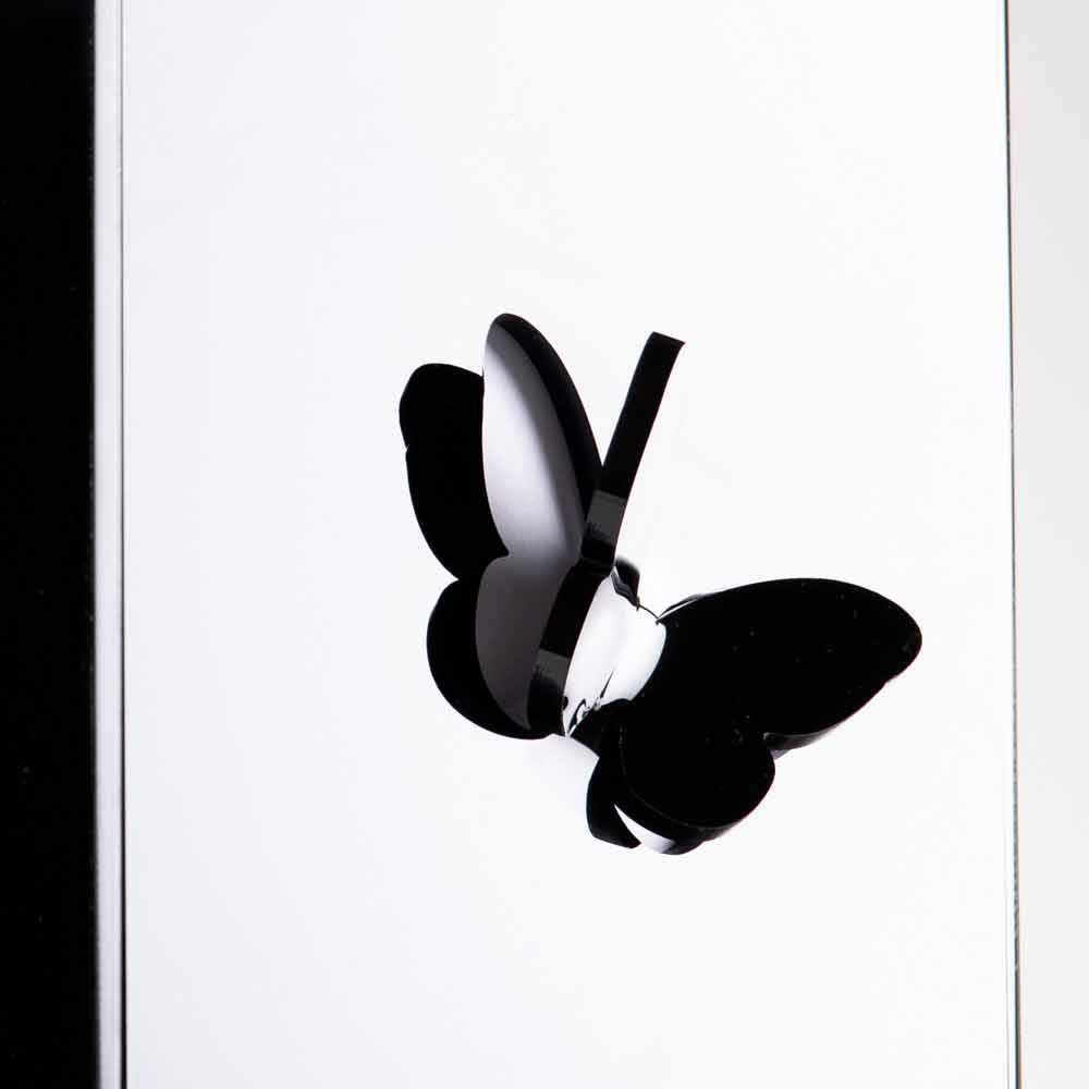Paraplystativet i sort plexiglas er kendetegnet ved repræsentationen af lasermærkede vintergrene og tredimensionelle dekorerede sommerfugle og rustfri stålbase.