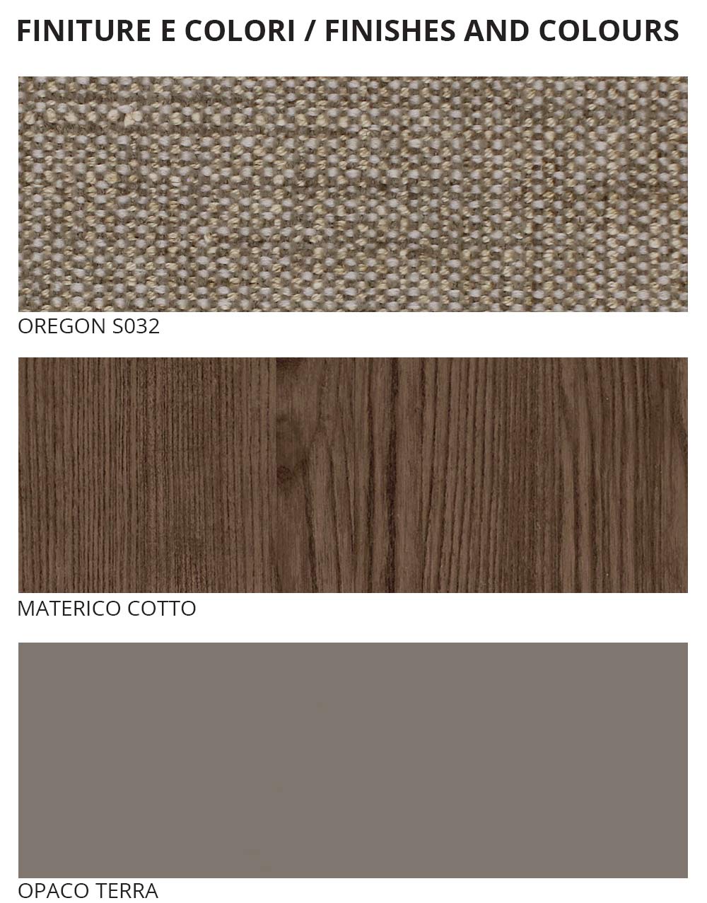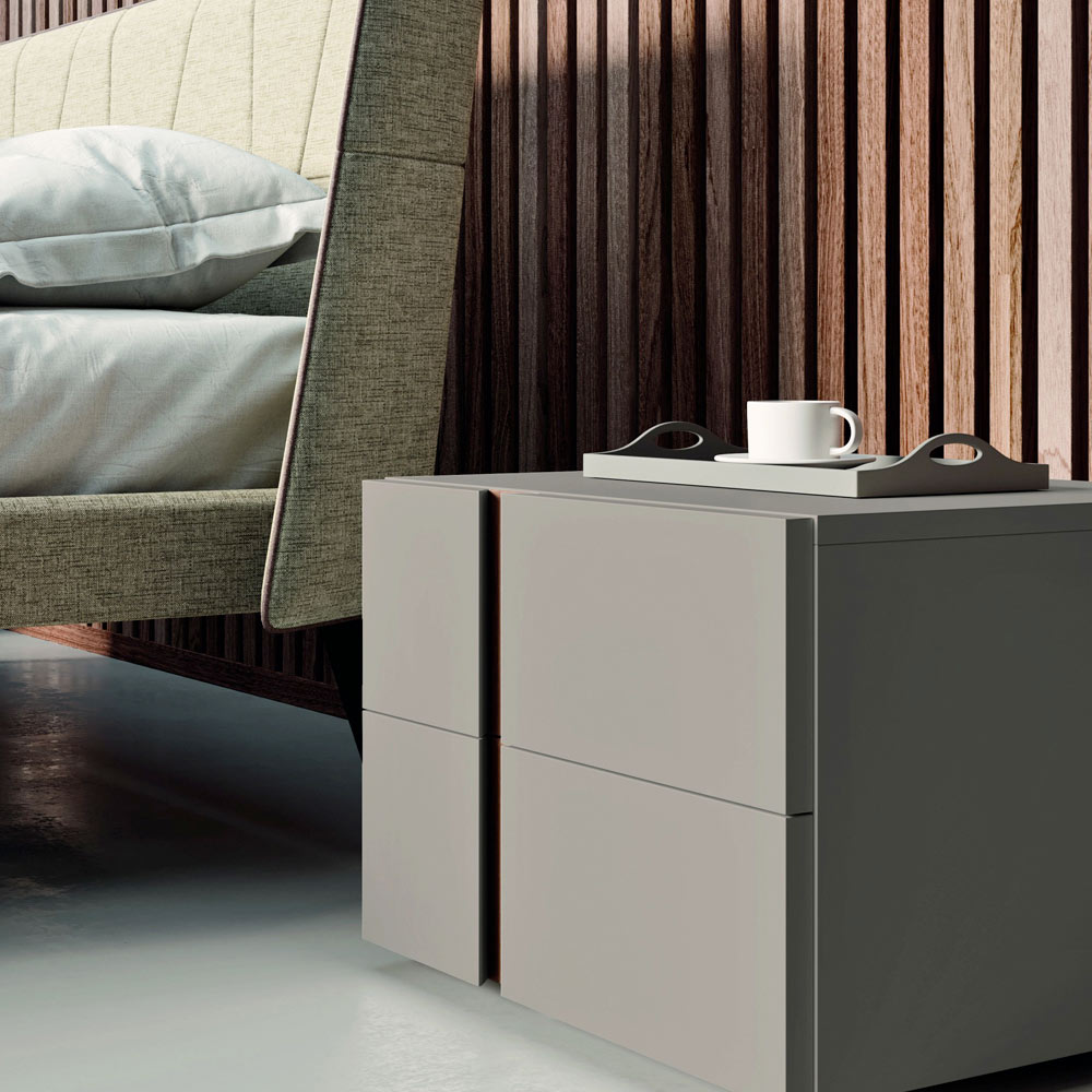 terracotta og mat terraklakeret træ med åbning gennem en praktisk rille placeret på skuffens front. Det særegne er repræsenteret ved den usædvanlige form på sengegavlen, der lukker indad og genskaber følelsen af et betryggende tilflugtssted og også er pyntet med det raffinerede design, der er skabt gennem sømmen på toppen. Sammen med sengebordene og kommoden har den skabte atmosfære en