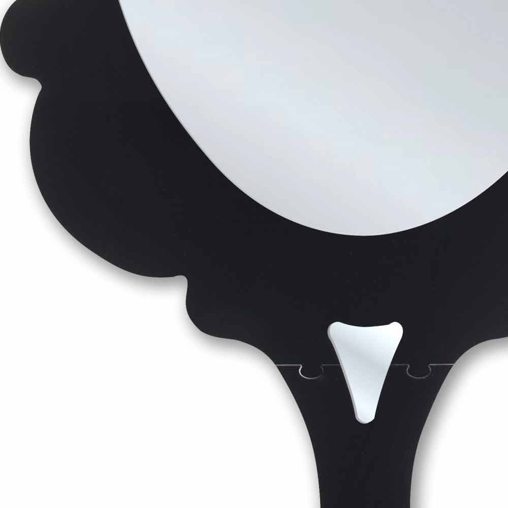 Spejl med vigtige stel i sort plexiglas, PMMA med 100% ren polymer fra eventyrlige silhuet af en håndtaske spejl, men ved størrelsen af et stort "spejl på væggen". Plexiglas er slagfast, ikke-deformerbart, uforanderlige og termoisolante.La lysstyrke og glans forbliver konstant og uændret. Plexiglass PMMA fra jomfru polymer er ikke-toksisk, hypoallergen, lugtfri og antibakteriel. Genanvendeligt 100% .Pensato, designet og fremstillet i Italien, med italienske materialer.