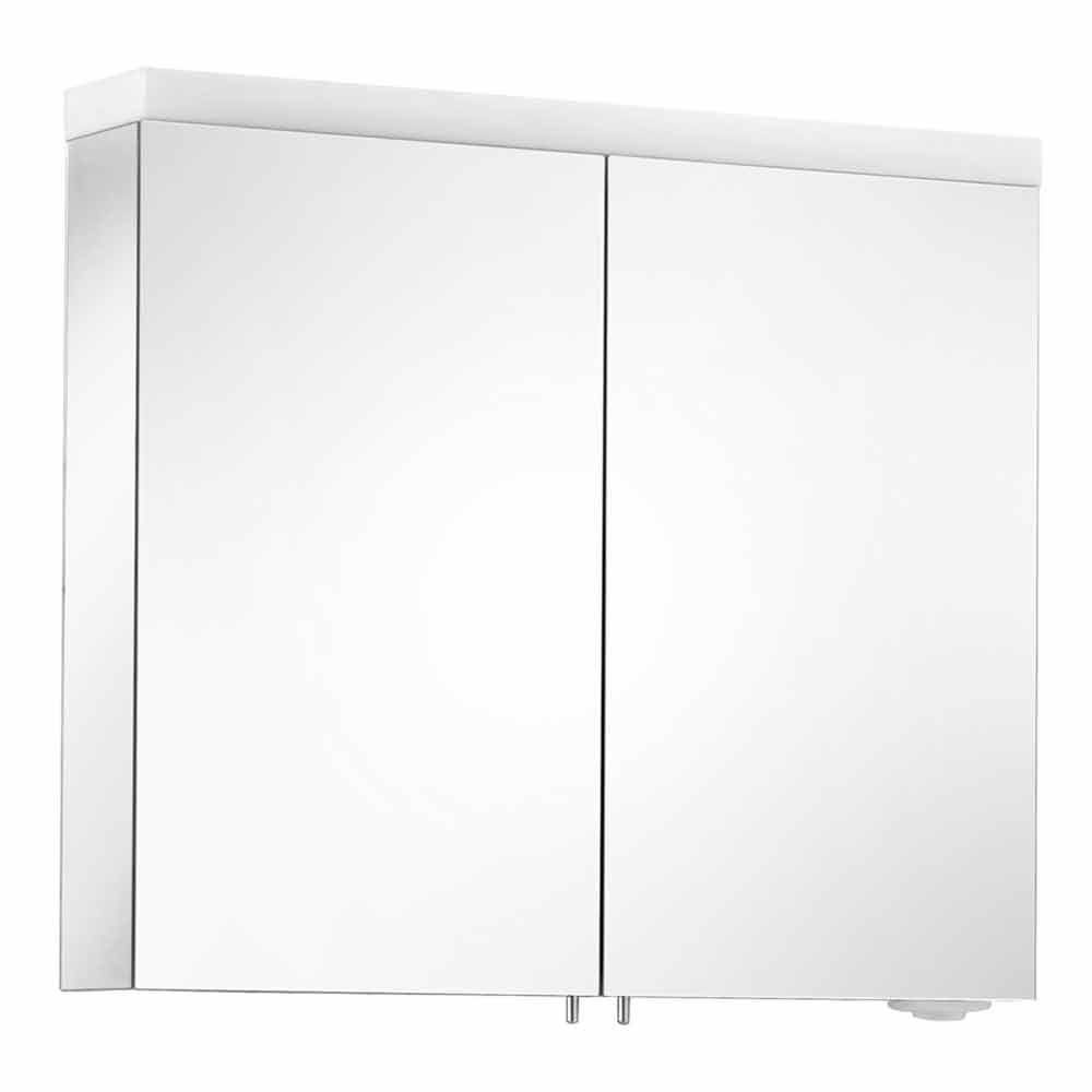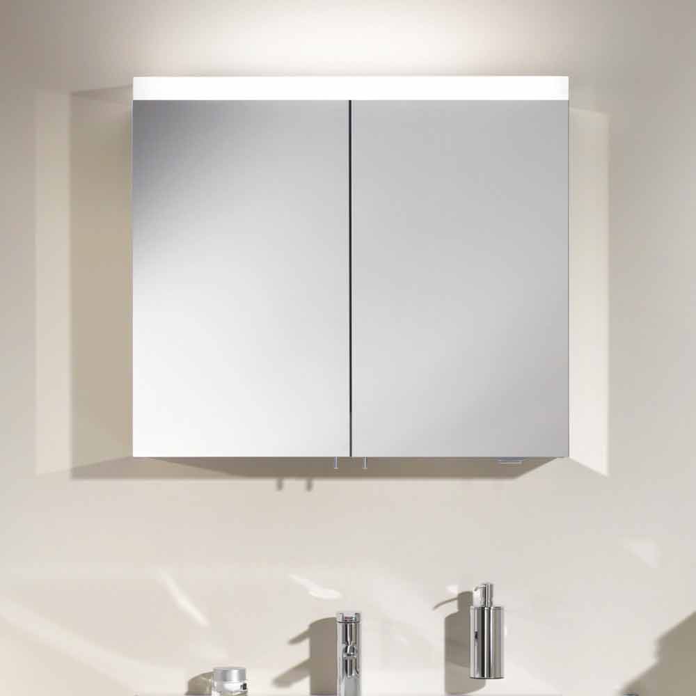 Denne type belysning udsender en varm hvid lysstråle, der er i stand til at skabe en behagelig og indbydende atmosfære. Sammen med den forreste, der dækker den øverste del af spejlet, beriges denne genstand af den nedre belysning, der fremhæver vandhanerne. Der er også en praktisk roterende dæmper placeret under kabinettet, der giver dig mulighed for at vælge mellem de 3 forskellige belysningstilstande og dæmpe lysintensiteten.