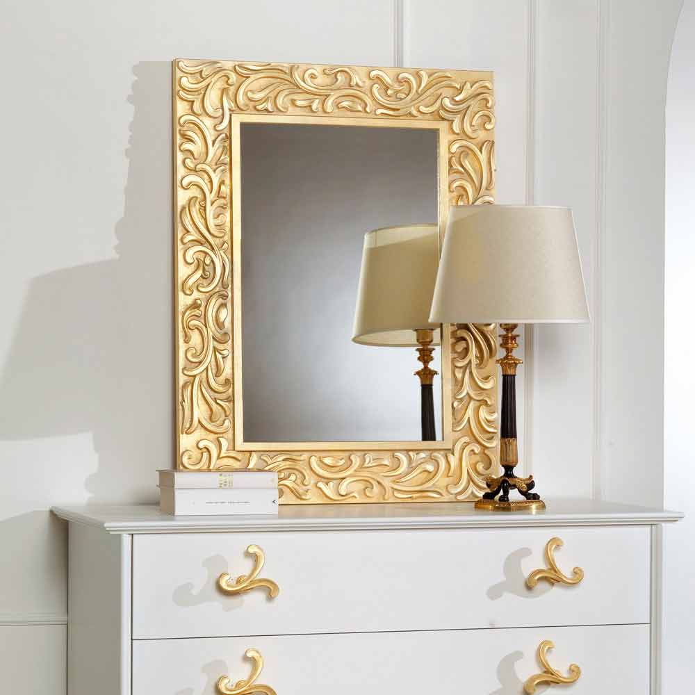 Spejlet Pepa er kendetegnet ved en håndværksmæssig udført ved anvendelse materialer af høj kvalitet og brug oplevelsen af faglærte italienske håndværkere. Rammen er lavet af træ med harpiks applikationer. bladguld syltede finish. Spejlglas, 4mm tykt. Made in Italy.