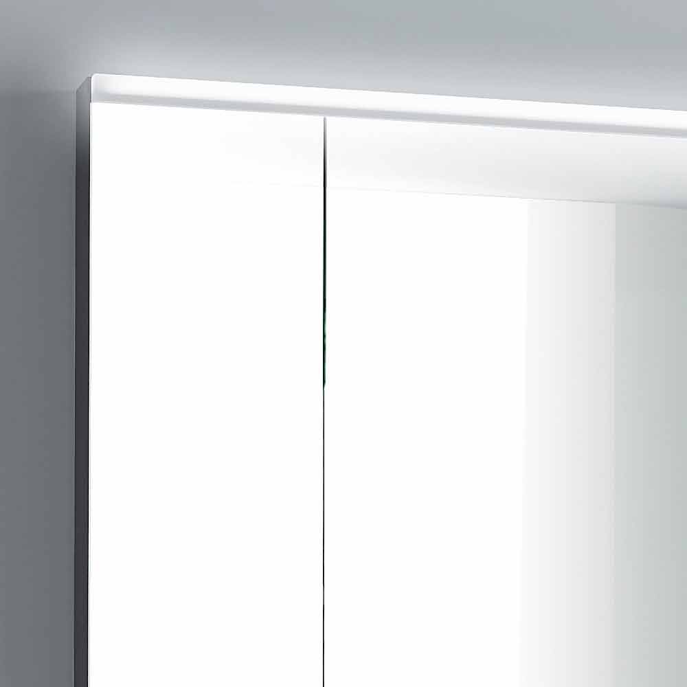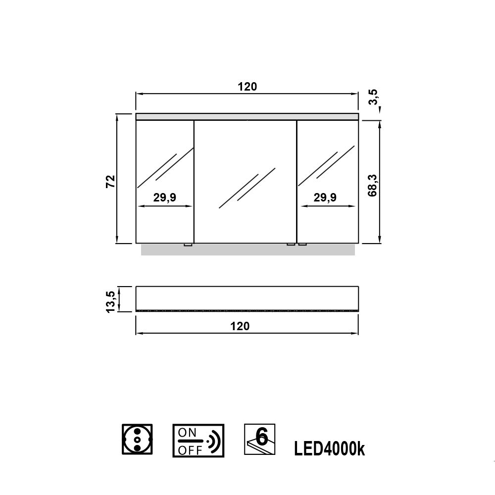 Skab med 3 spejllåger. En tynd linje af lys kendetegner profilen af dette kabinet til at tilbyde en perfekt frontal belysning. Integreret i topkonstruktion og bunden af den fulde omgivende belysning lyseffekten af dette spejl styres af en sensor. Bekvem åbning af dørene gennem en krom stål håndtere. Struktur i FENIX, polymere materiale med nano teknologiske behandling, vandafvisende, anti-fingeraftryk og blød at røre ved. Leveres med sokkel og switch.
