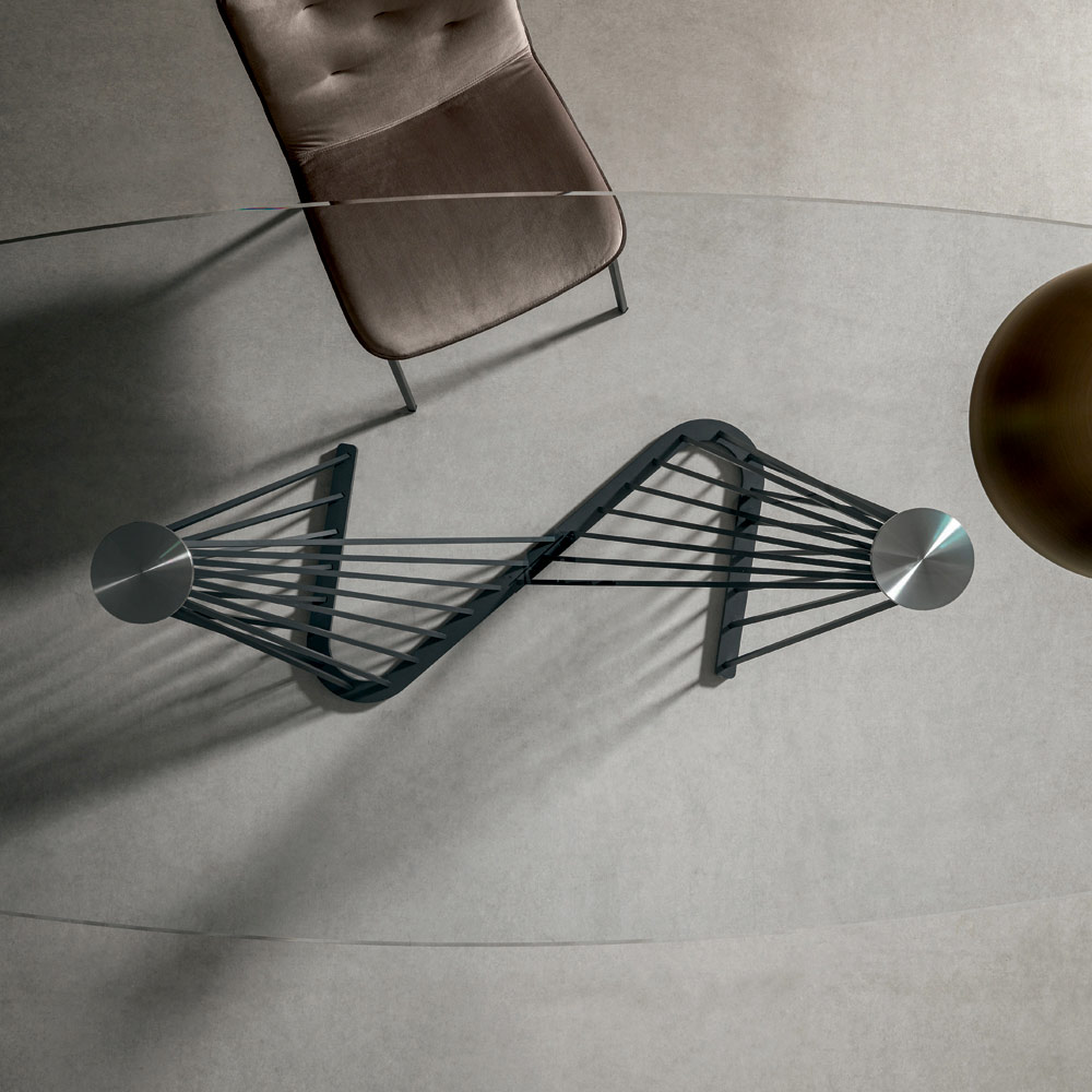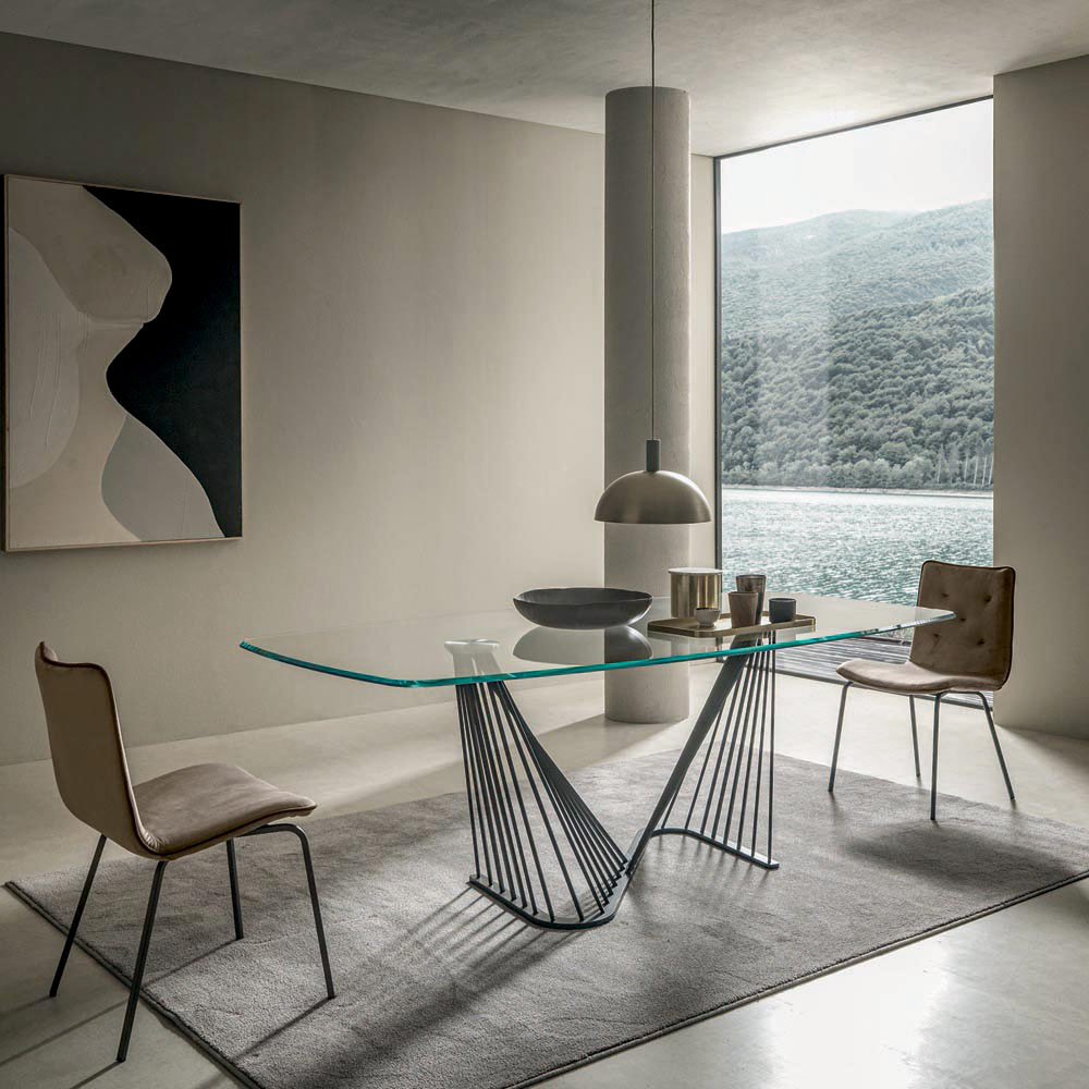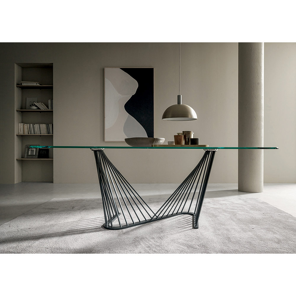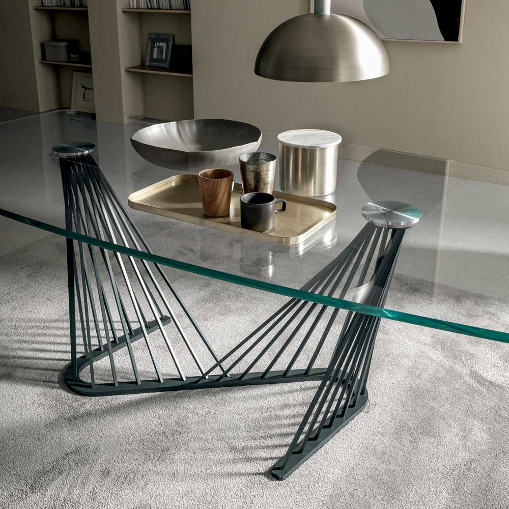 Spisebord i gennemsigtigt glas og fod med metalreb, 2 størrelser fremstillet i Italien.
