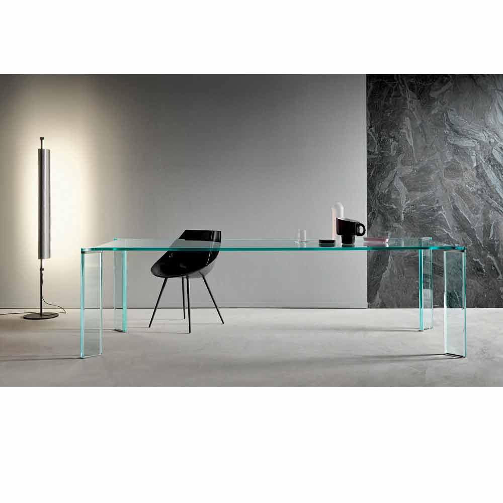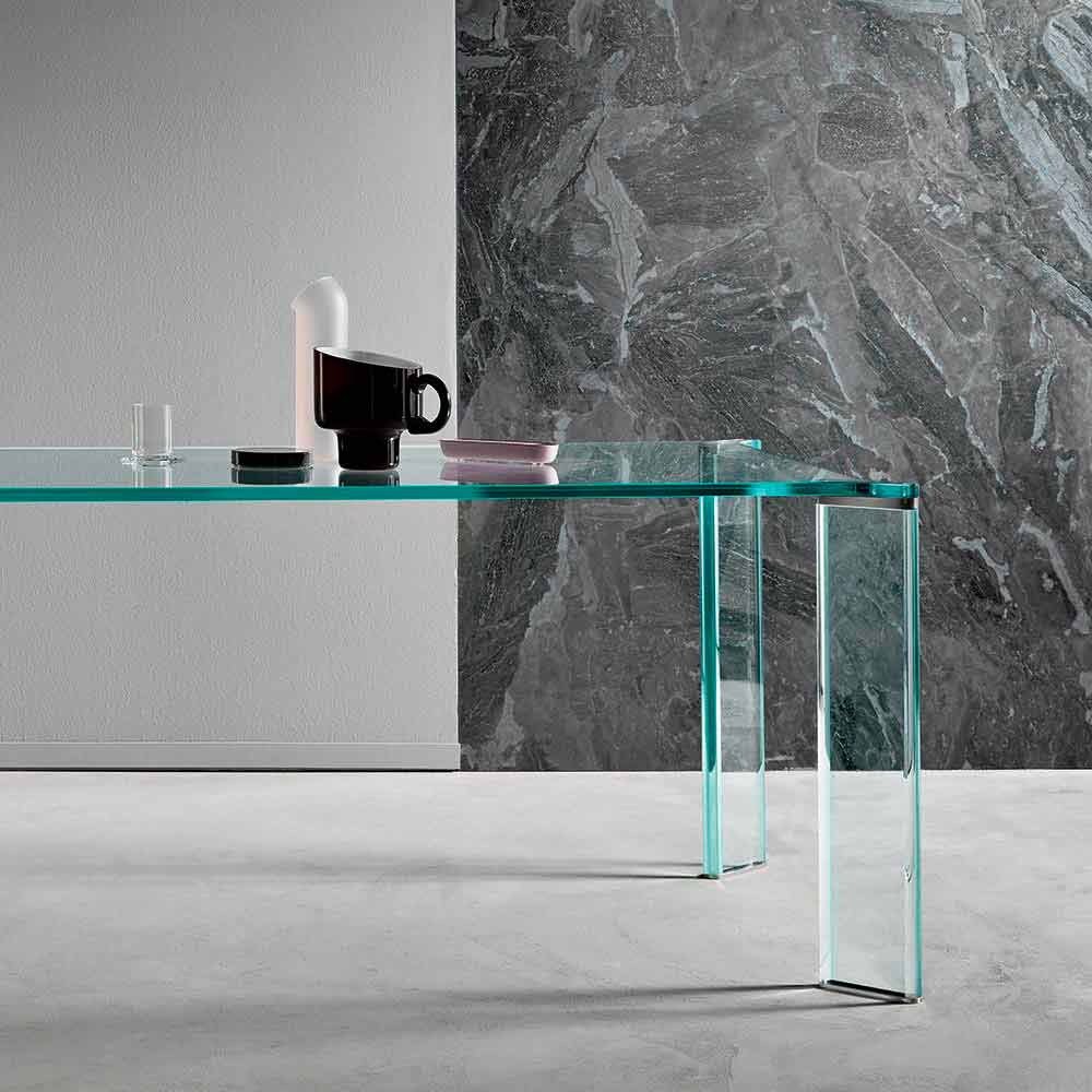 Benene er lavet af en lamineret glasplade og er lavet af 40 mm tykt ekstra klart glas med endeplader, der forbinder ben og fødder i rustfrit stål.