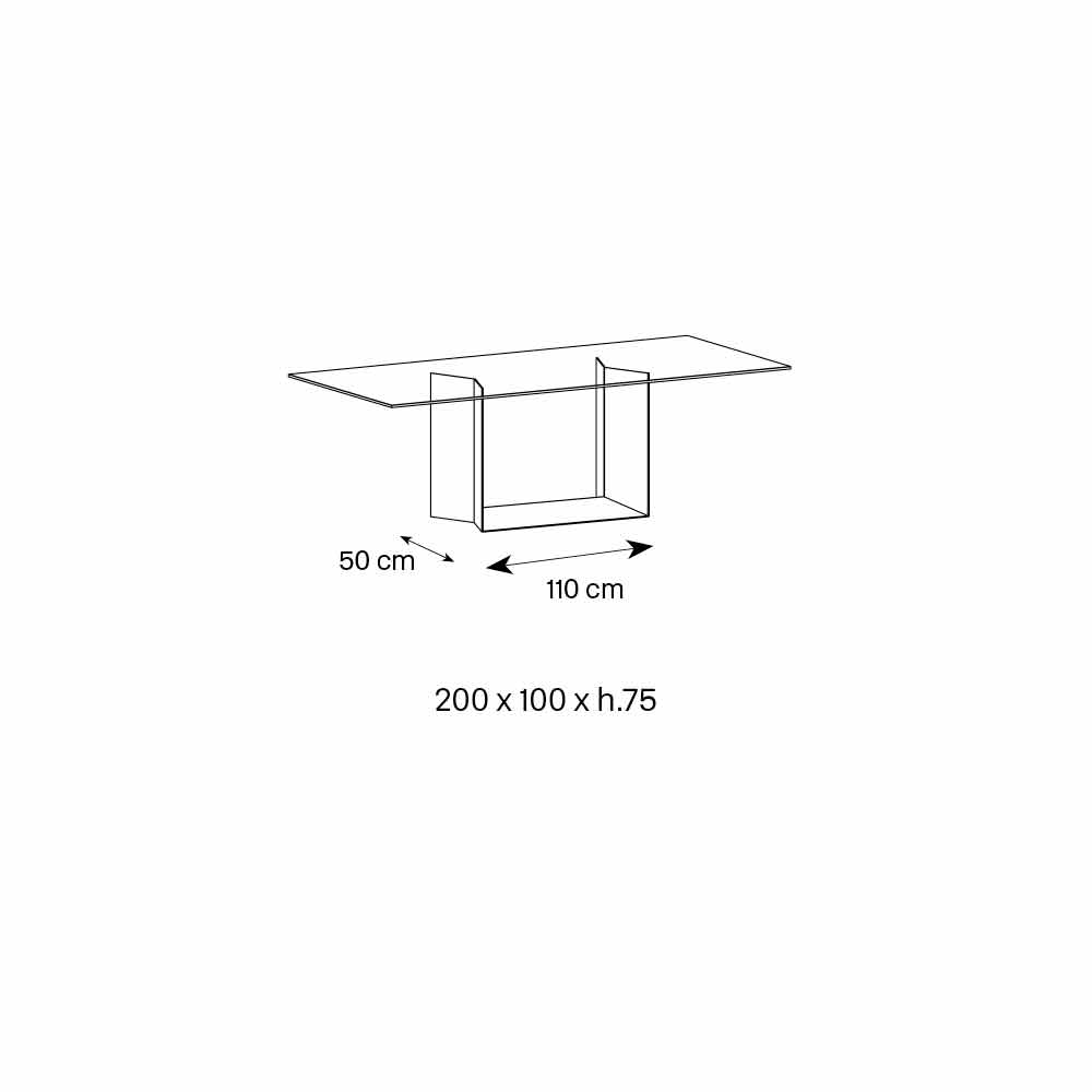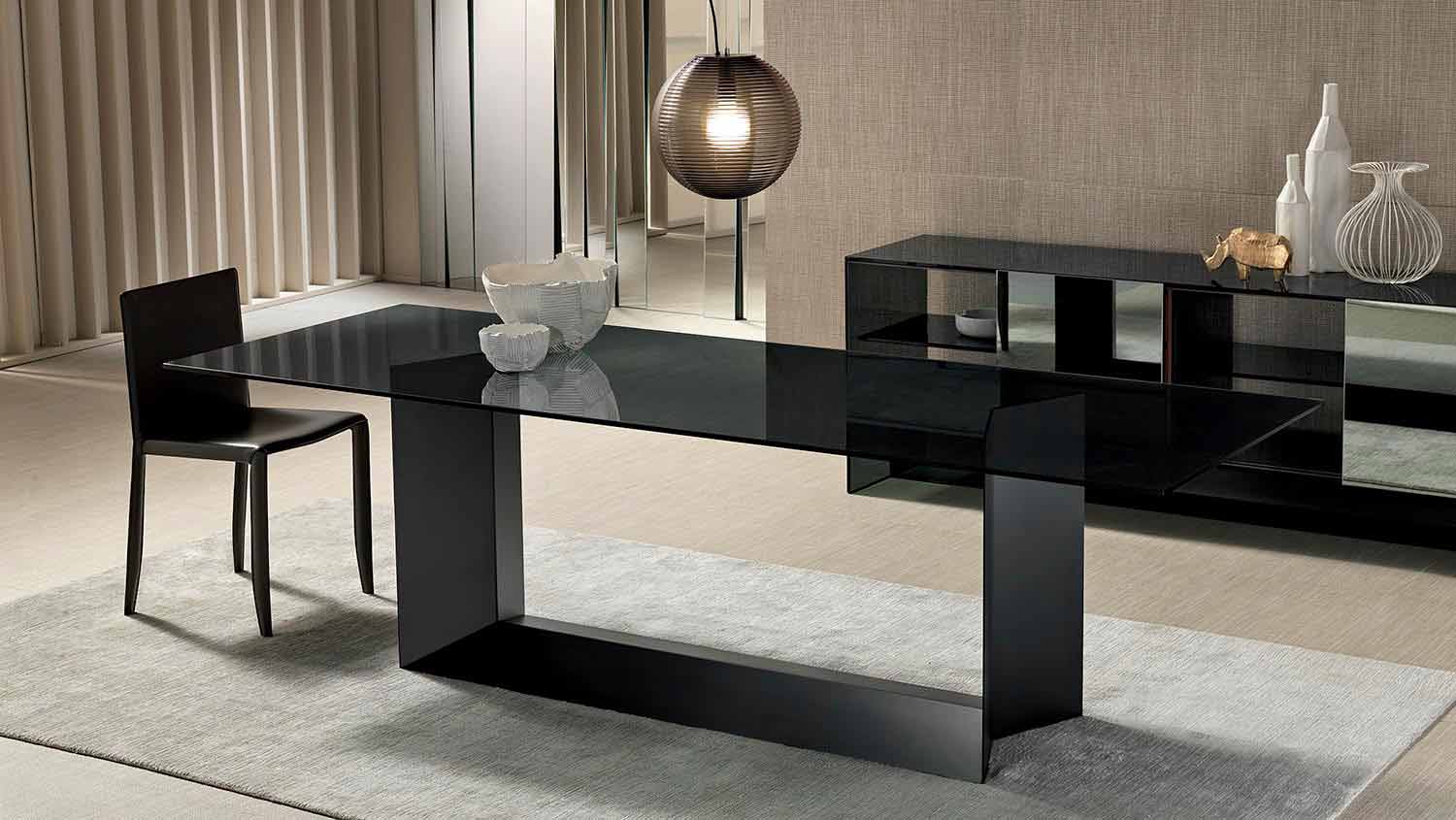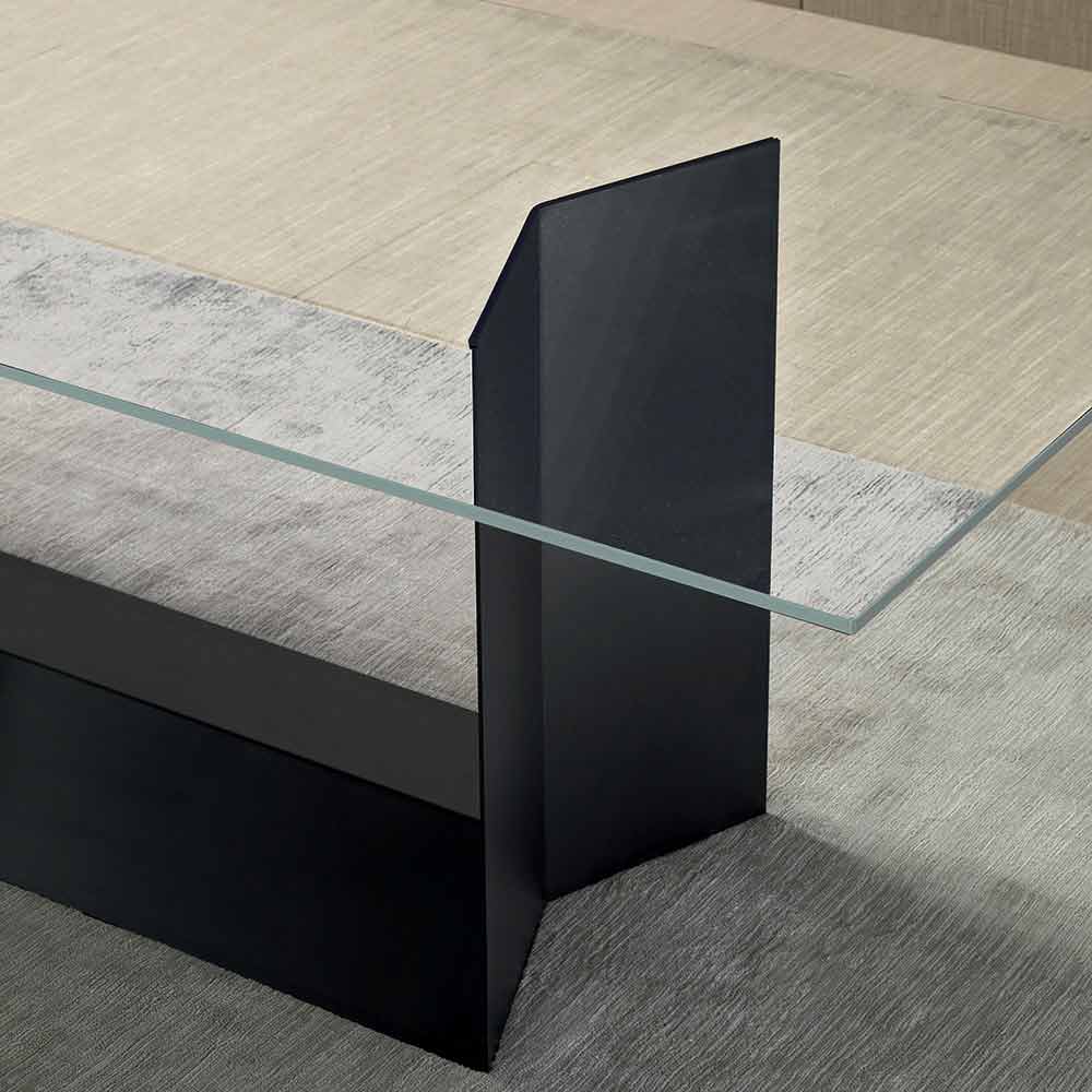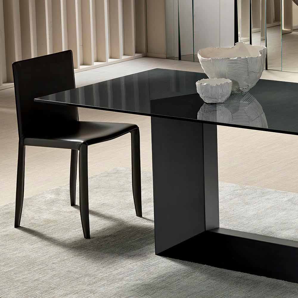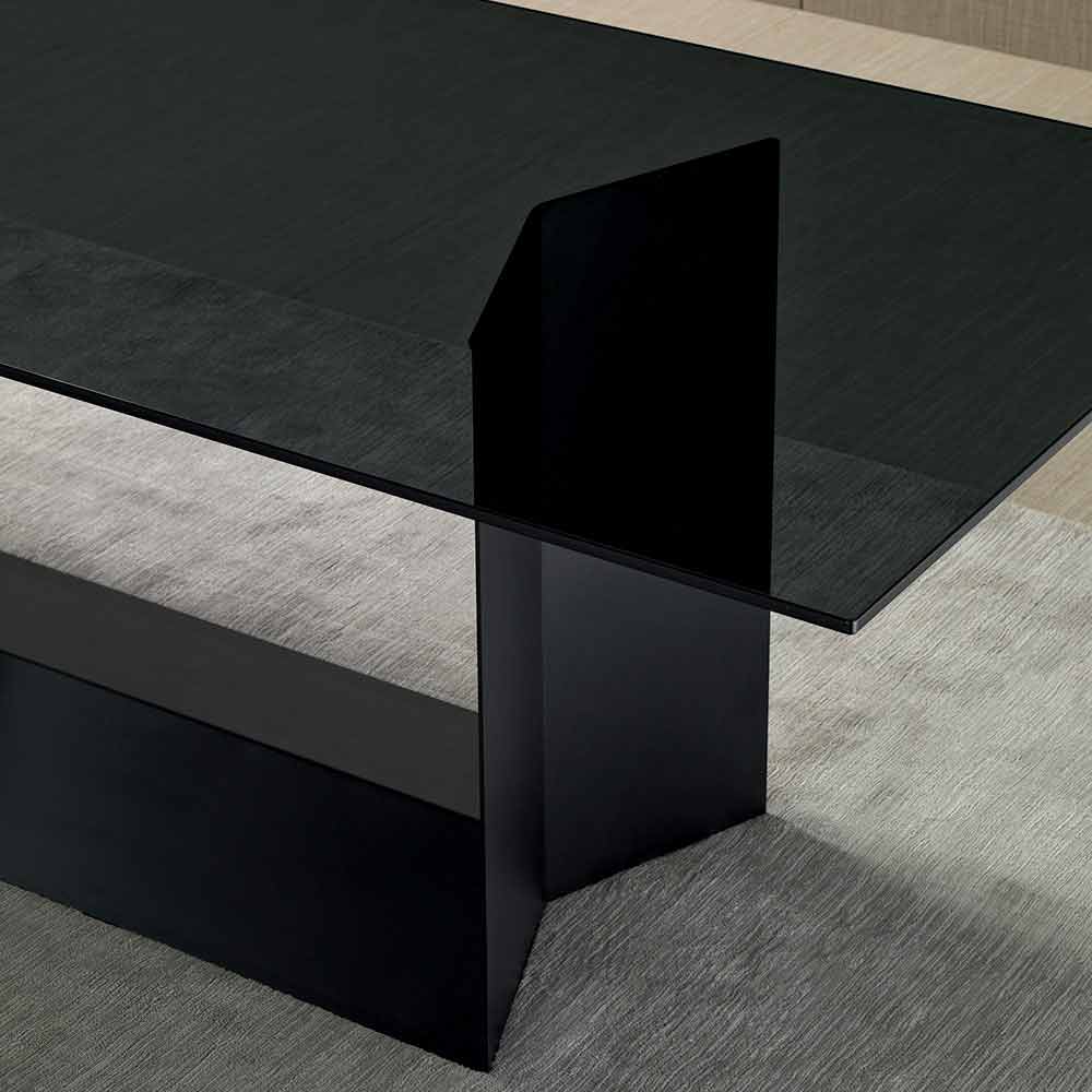 Luksusbord med røget eller ekstra klar glasplade og base i mat grafit sort metal, fremstillet i Italien.
