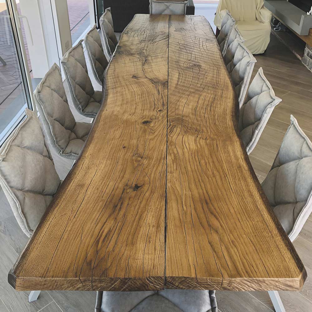 Toppen fås direkte fra bagagerummet. To halvdele er opnået fra de verdslige egetræsstammer og sat sammen for at skabe unikke stykker med variabel bredde fra 90 til 100 cm. Træets bark er bevaret i sin naturlighed, hvilket skaber en ekstraordinær effekt.