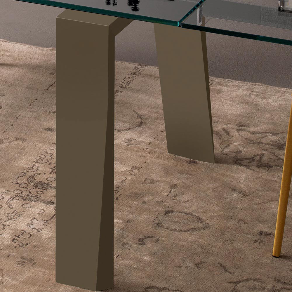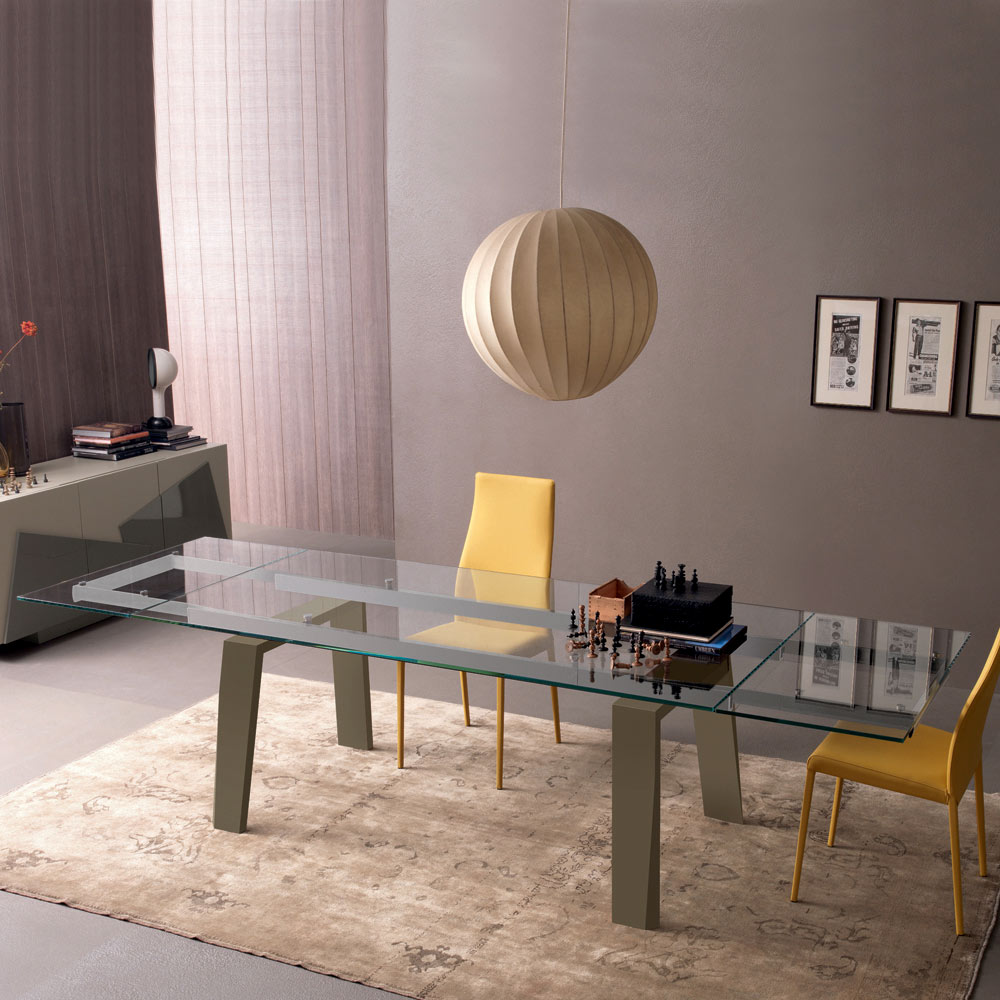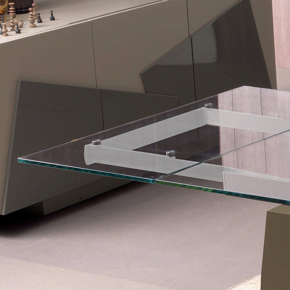 Udtrækkeligt spisebord i transparent glas og ben i lakeret træ, 2 størrelser fremstillet i Italien.