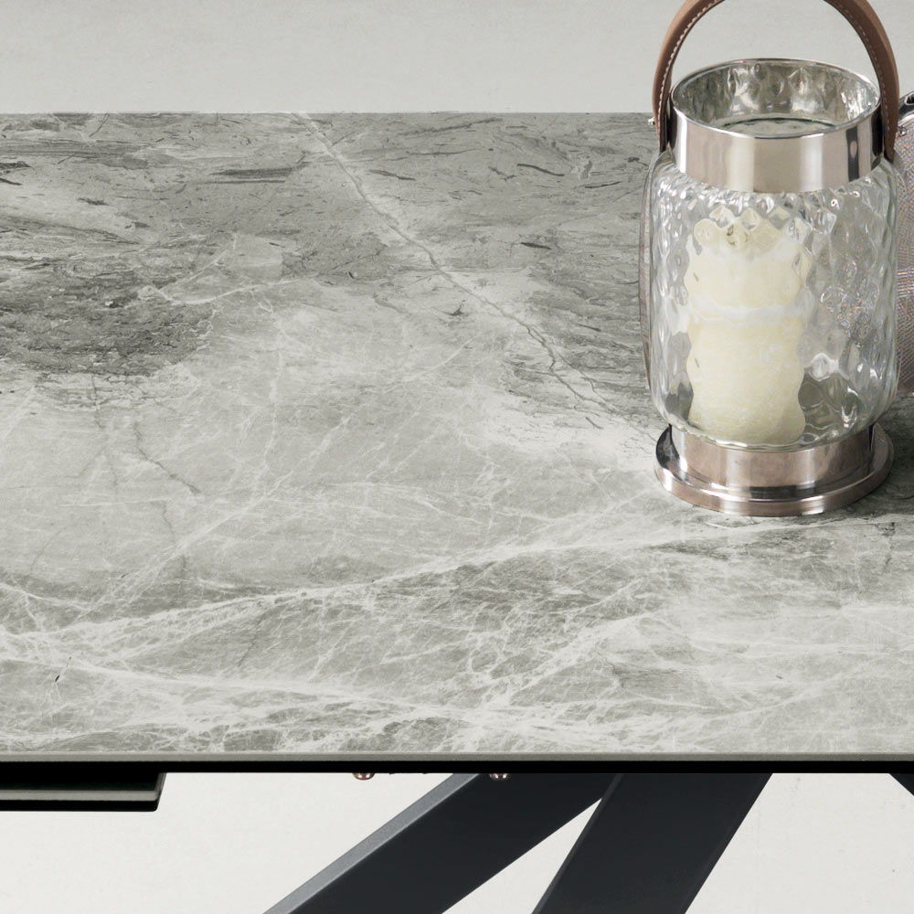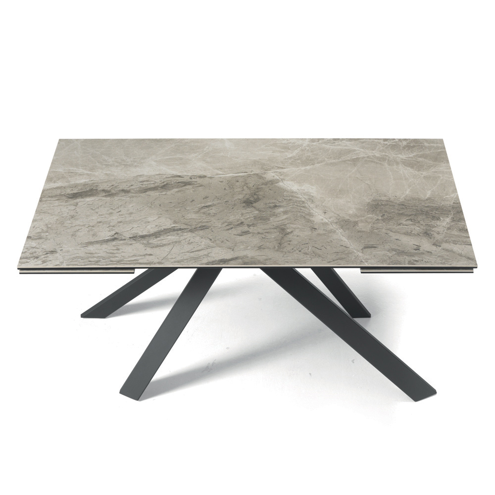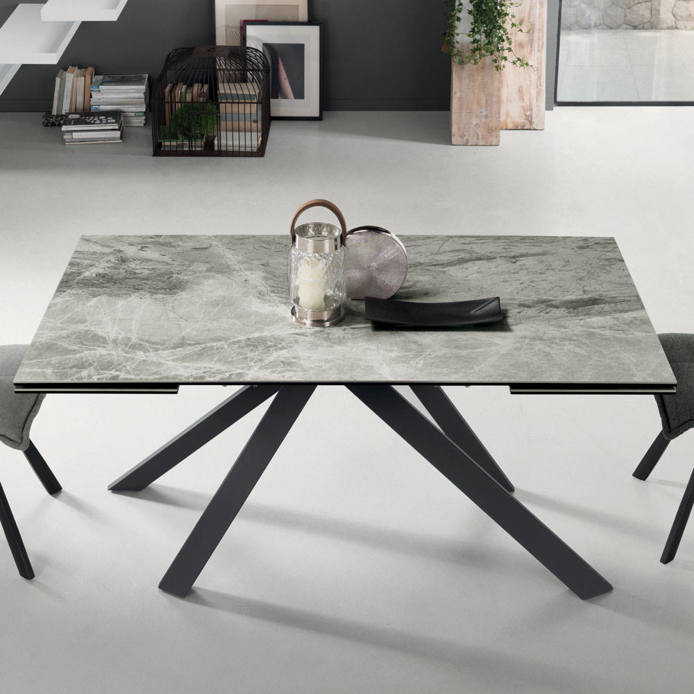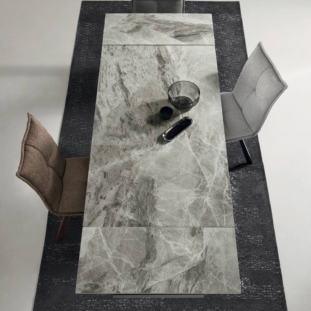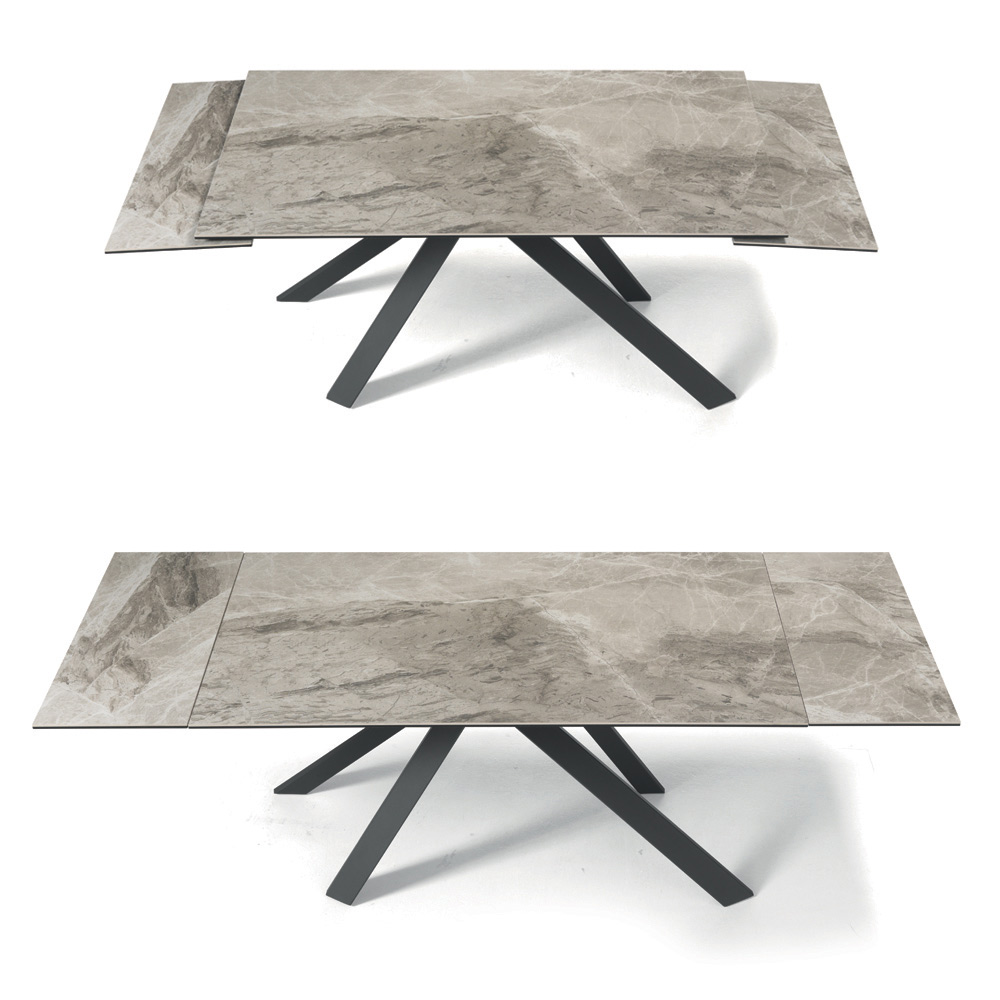Spisebord med plade lavet af marmor-effekt porcelæn stentøj kan udvides op til 240 cm takket være de to medfølgende 40 cm tillægsplader og malet metalstruktur . Dette produkt er perfekt til dem, der elsker at organisere frokoster og middage med venner uden at ofre stil og elegance.