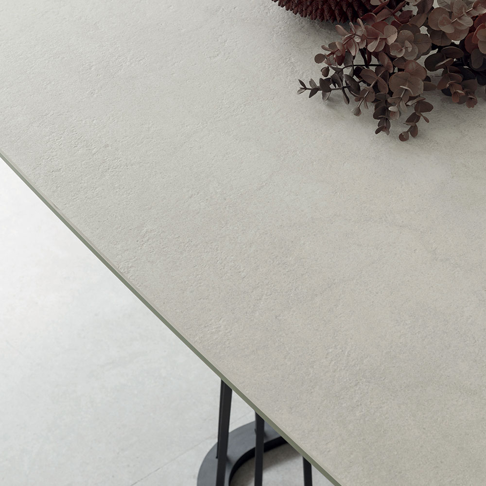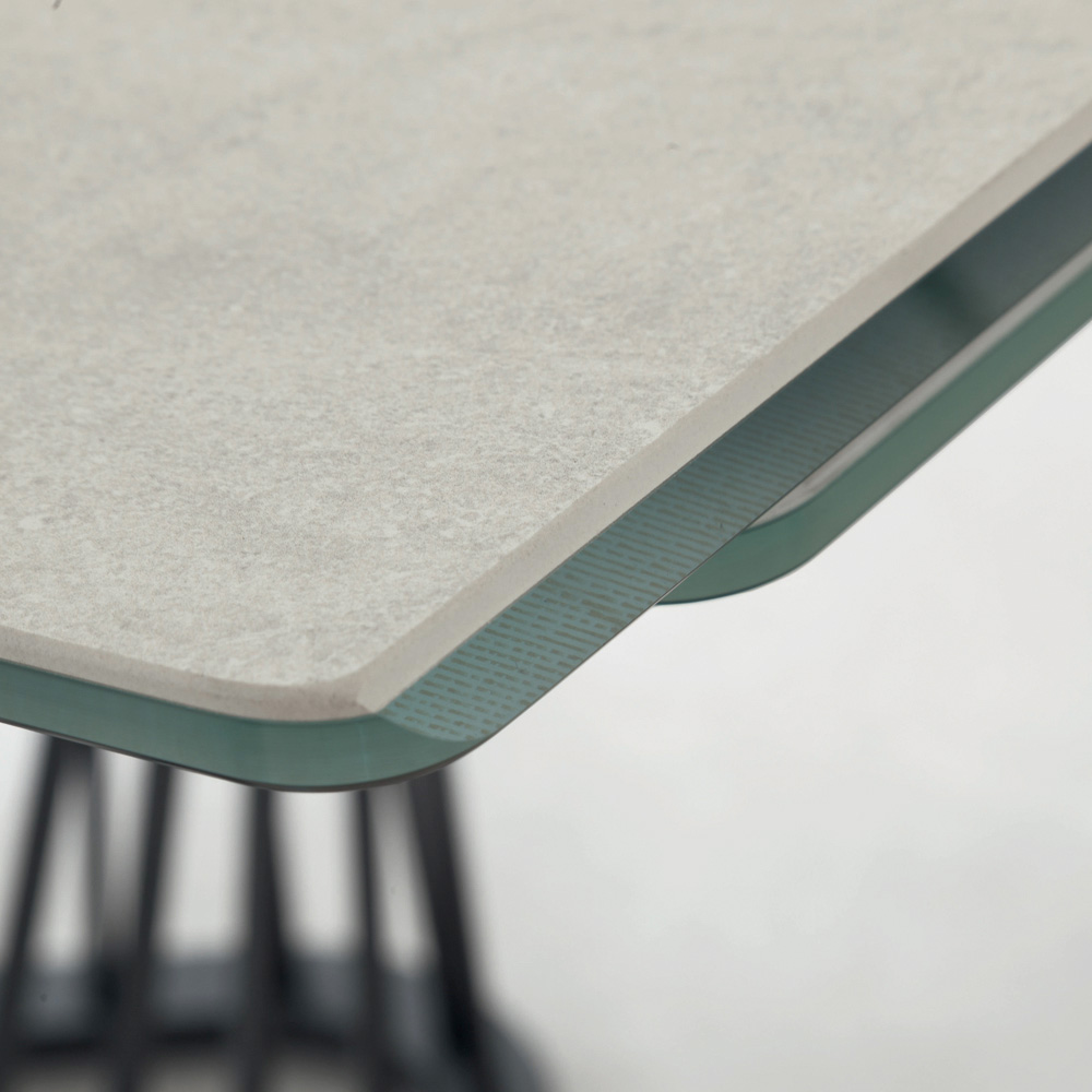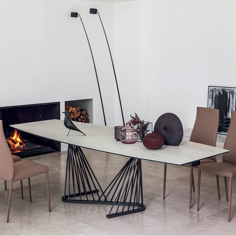 Udtrækkeligt spisebord i keramik og fod med metalreb fremstillet i Italien.
