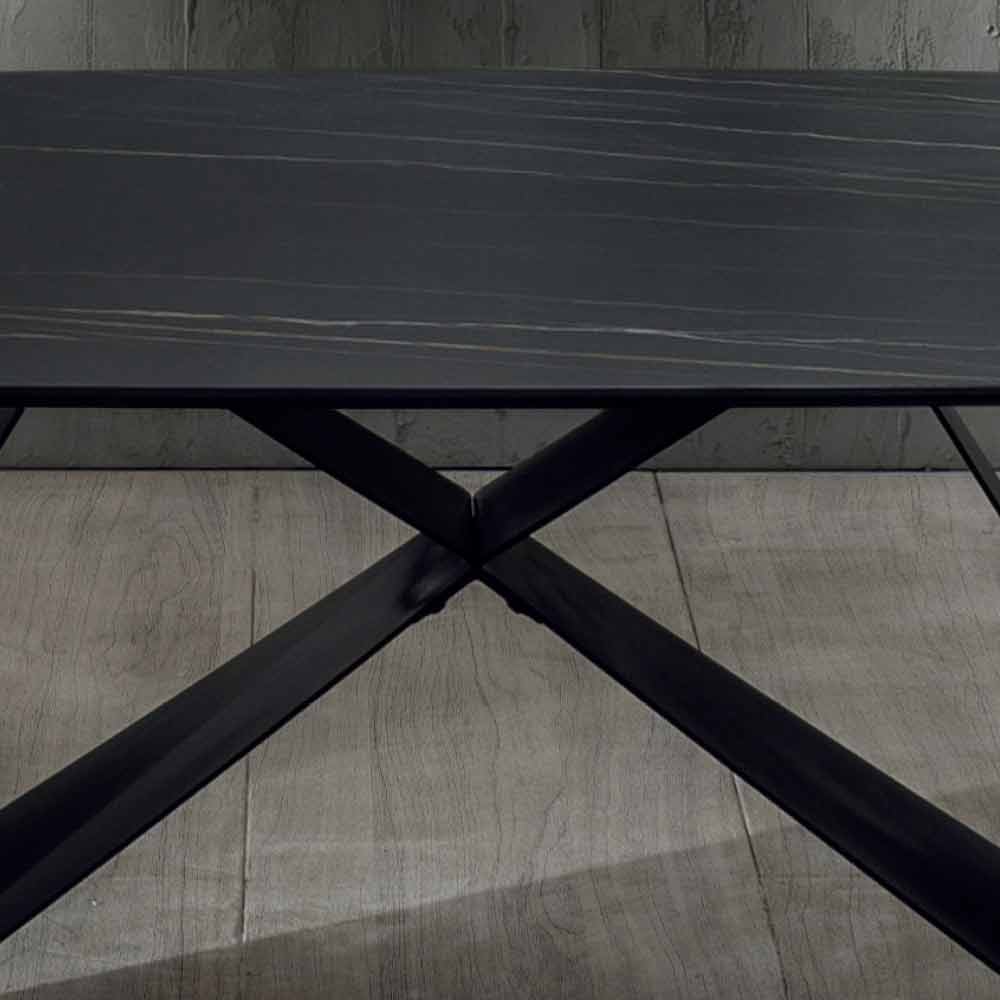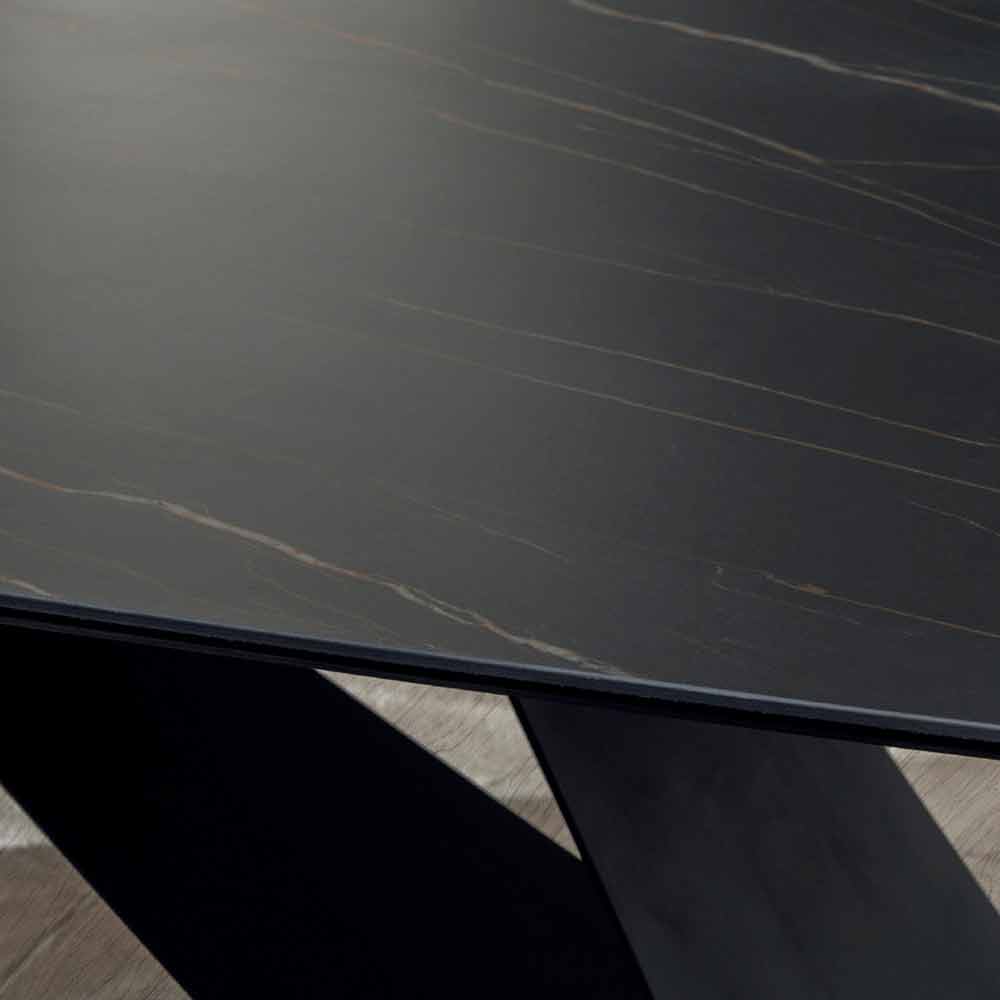 Dette spisebord er et produkt med en stærk visuel effekt, der er i stand til at erobre midten af scenen med stor elegance. Dens struktur er lavet af mat antracitlakeret metal, mens toppen består af et øverste lag af ren keramik med en 6 mm tyk portoro-effekt, hvorunder et 8 mm tykt lag af glas påføres, hvilket giver den keramiske fleksibilitet, hvilket gør det muligt at undgå skader . Desuden takket være sin store størrelse kan bordet rumme op til 10 personer, hvilket gør det muligt at spise frokost og middag med venner. Hvad der adskiller denne artikel er utvivlsomt det specielle design af basen, som takket være de geometriske spil skabt af metalpladerne giver bevægelse og karakter til bordet. Kombinationen af udvalgte materialer og finish muliggør opnåelse af et slutprodukt med et ekstremt moderne design, ideelt til indretning af værelser med en sofistikeret og elegant smag.