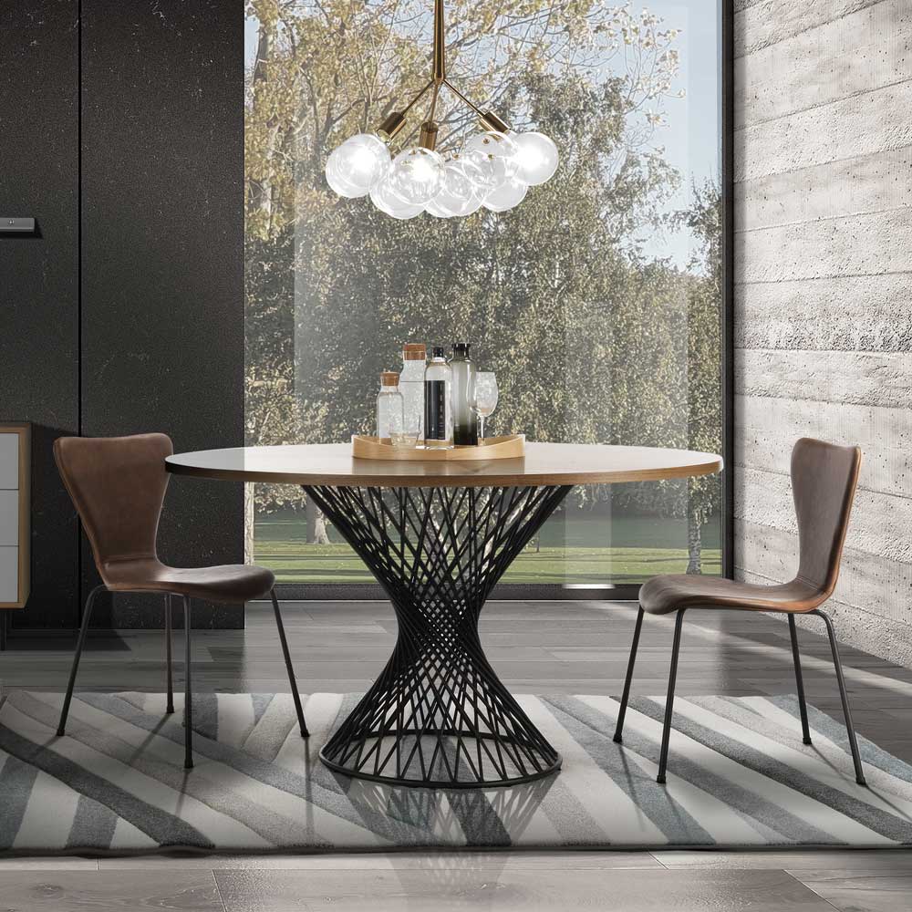 Spisebord med rund plade af fineret mdf med egetræsfinish og fod i matsort lakeret metal . Et møbel med en rustik stil præget af strukturens særlige form, som giver produktet en følelse af dynamik takket være dets spiralform. Takket være dens lille størrelse vil det også være muligt at indrette spisestuer eller køkkener med begrænsede pladser med personlighed uden at skulle give afkald på et strejf af karakter og innovation .