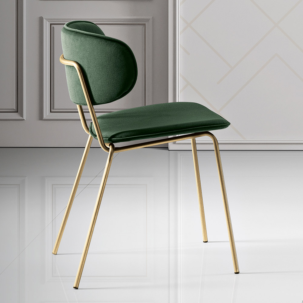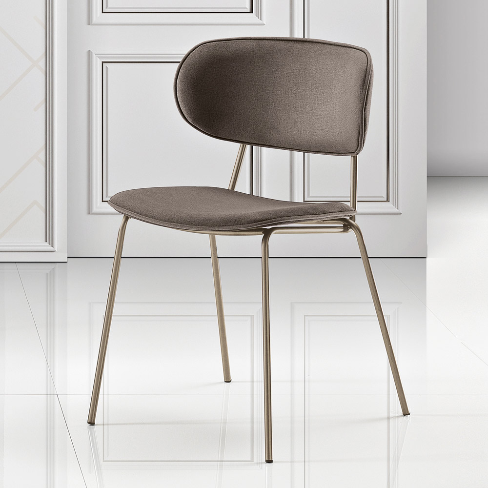 Denne stol er en designjuvel, perfekt til dem, der ønsker at kombinere funktionalitet og stil. Sædet og det buede ryglæn er dækket af et stof, hvilket giver en komfortabel og klassisk siddeoplevelse. Stolens enkle, men sofistikerede silhuet fremhæves af metalbenene , som tilføjer et strejf af moderne varme og en følelse af visuel lethed.