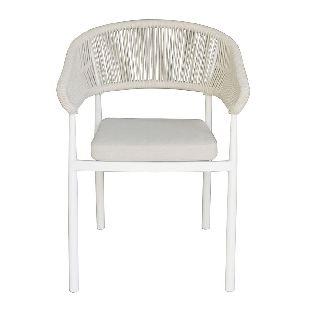 Giv et strejf af sofistikeret stil og funktionalitet til dine udendørs miljøer med denne moderne designstol. Ryglænet i reb tilføjer et element af håndlavet elegance, mens sædet med lameller i aluminium giver styrke og komfort, hvilket gør den ideel til hverdagsbrug.