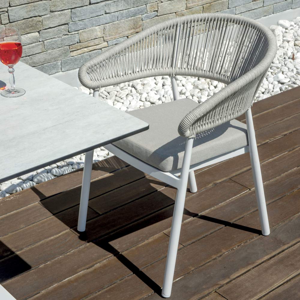 Den holdbare og lette aluminiumsstruktur er perfekt til at klare alle vejrforhold uden at miste sin oprindelige skønhed. Takket være den stabelbare funktion kombinerer denne stol design og funktionalitet, så du kan optimere pladsen uden at gå på kompromis med æstetikken.