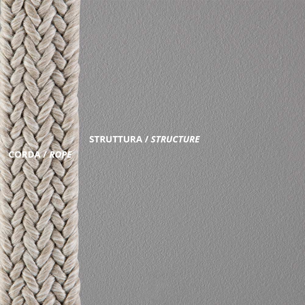 2 stabelbare lænestole til havemøbler håndlavet i Italien i mudderfarvet galvaniseret stål med sæde og ryglæn i mudderfarvet reb . Galvaniseringen giver større modstandsdygtighed over for materialets overfladebehandling over for ætsende atmosfæriske stoffer såsom salt og regnens surhed, mens rebene er modstandsdygtige over for klor og solstråler samt anti-skimmel.